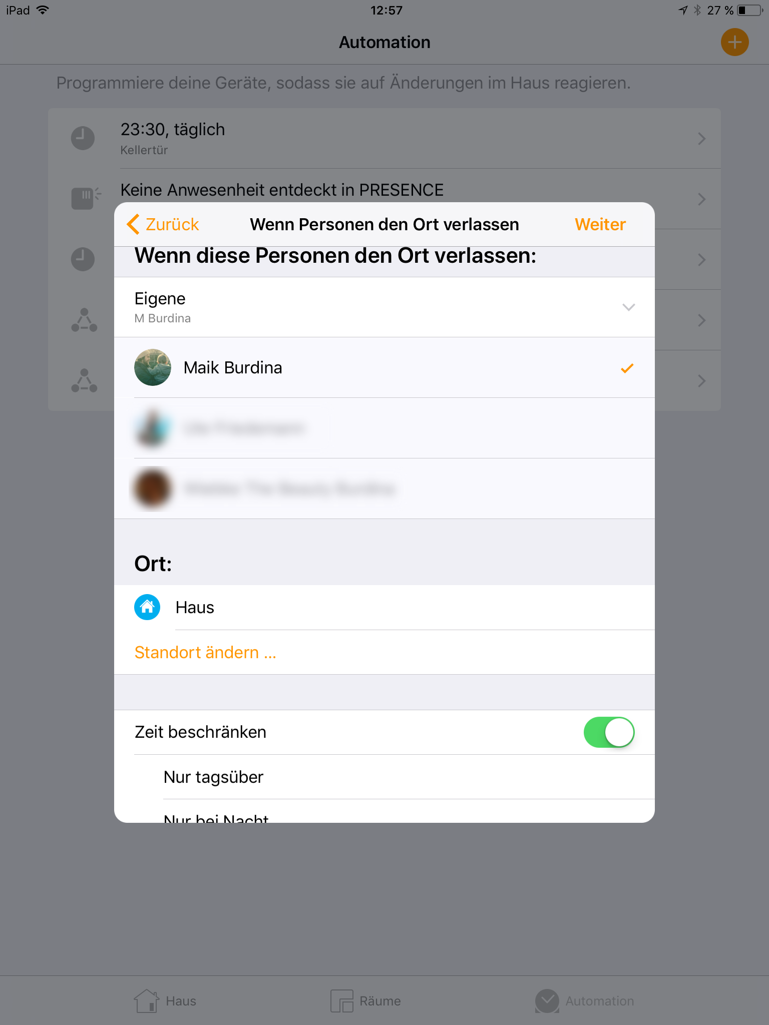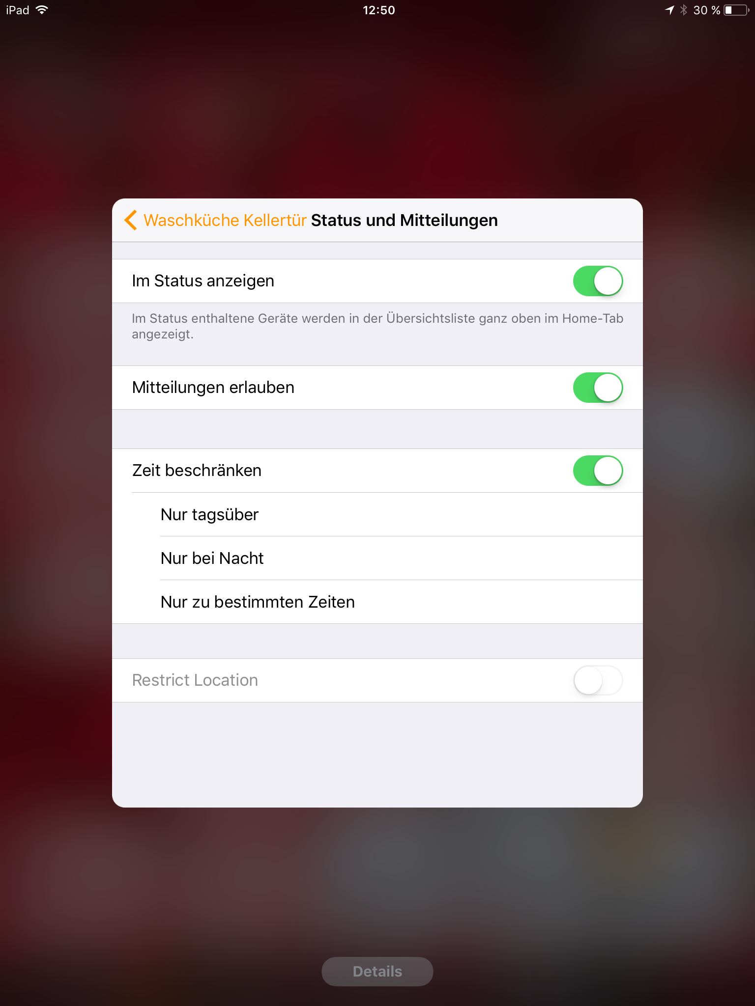 Mit iOS 11 scheint es wenigstens zu funktionieren, die Push Meldungen an Bedingungen zu knüpfen. Also nur Meldung wenn Tür aufgeht und man außer Haus ist. Das wird aber nicht Dein Anliegen lösen befürchte ich...