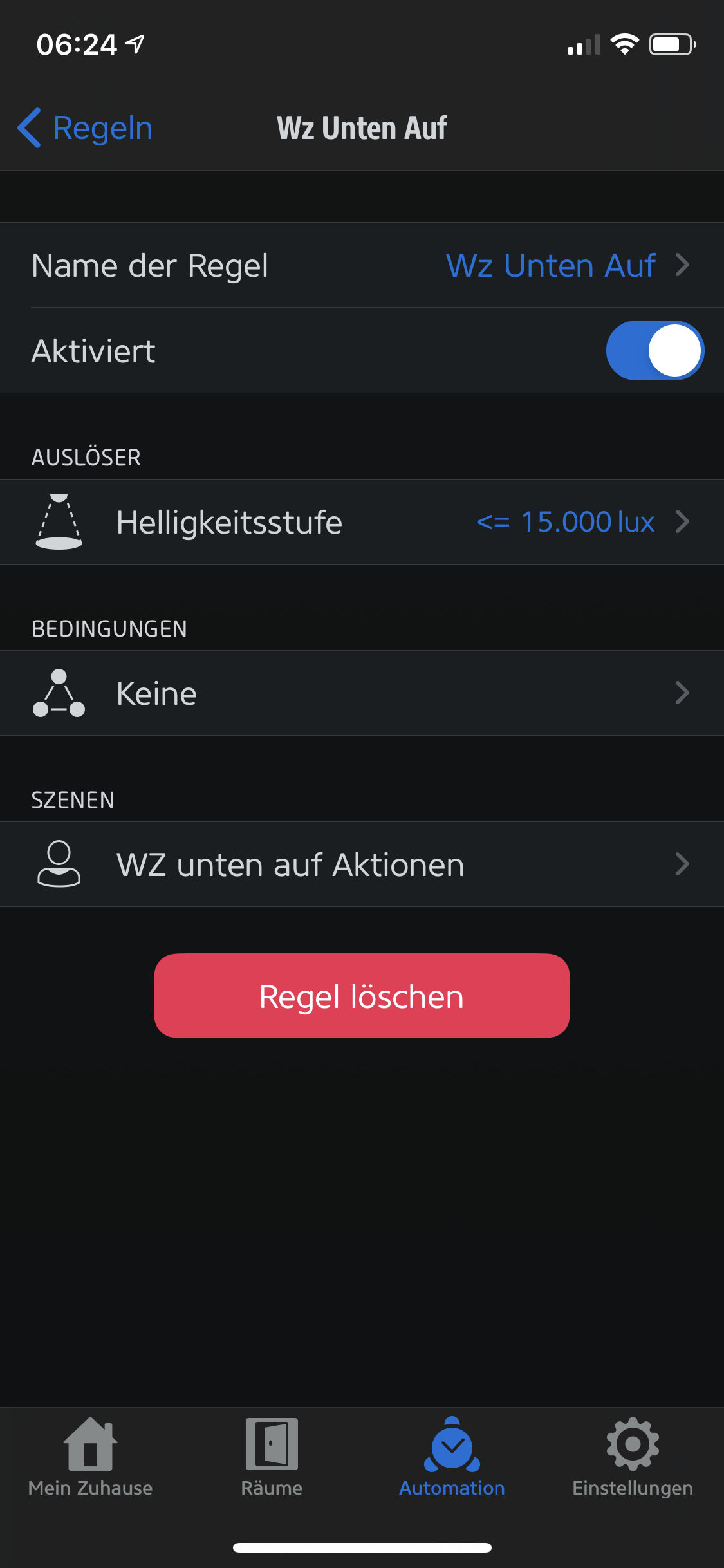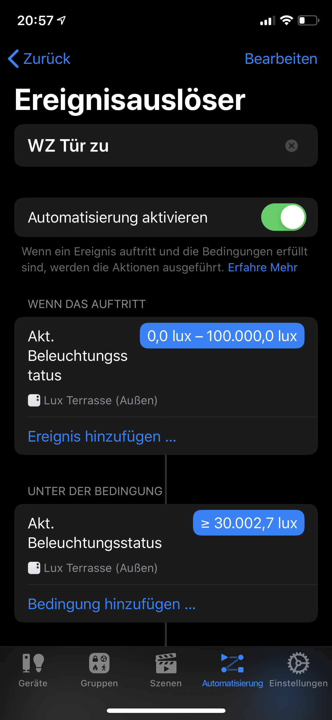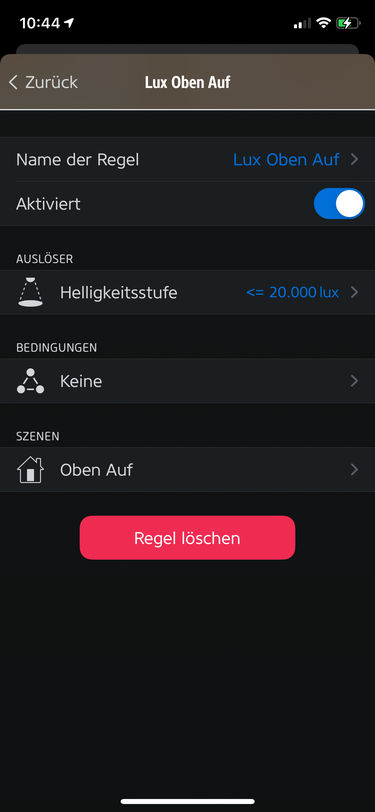 ich brauche eure Hilfe denn ich möchte meine Rollladen schließen denn der Sonnensensor für 2 Minuten über 40 kL liegt, öffnen sollen diese wieder wenn für 10 Minuten der Wert von 20 kL unterschritten wird. Das soll eigentlich immer an sein. Mit Home+ bekomme ich es hin das sie fahren wenn die Werte über oder unterschritten werden - ich möchte aber unbedingt die Zeitverzögerung - denn sonst fährt hier alles hoch und runter.