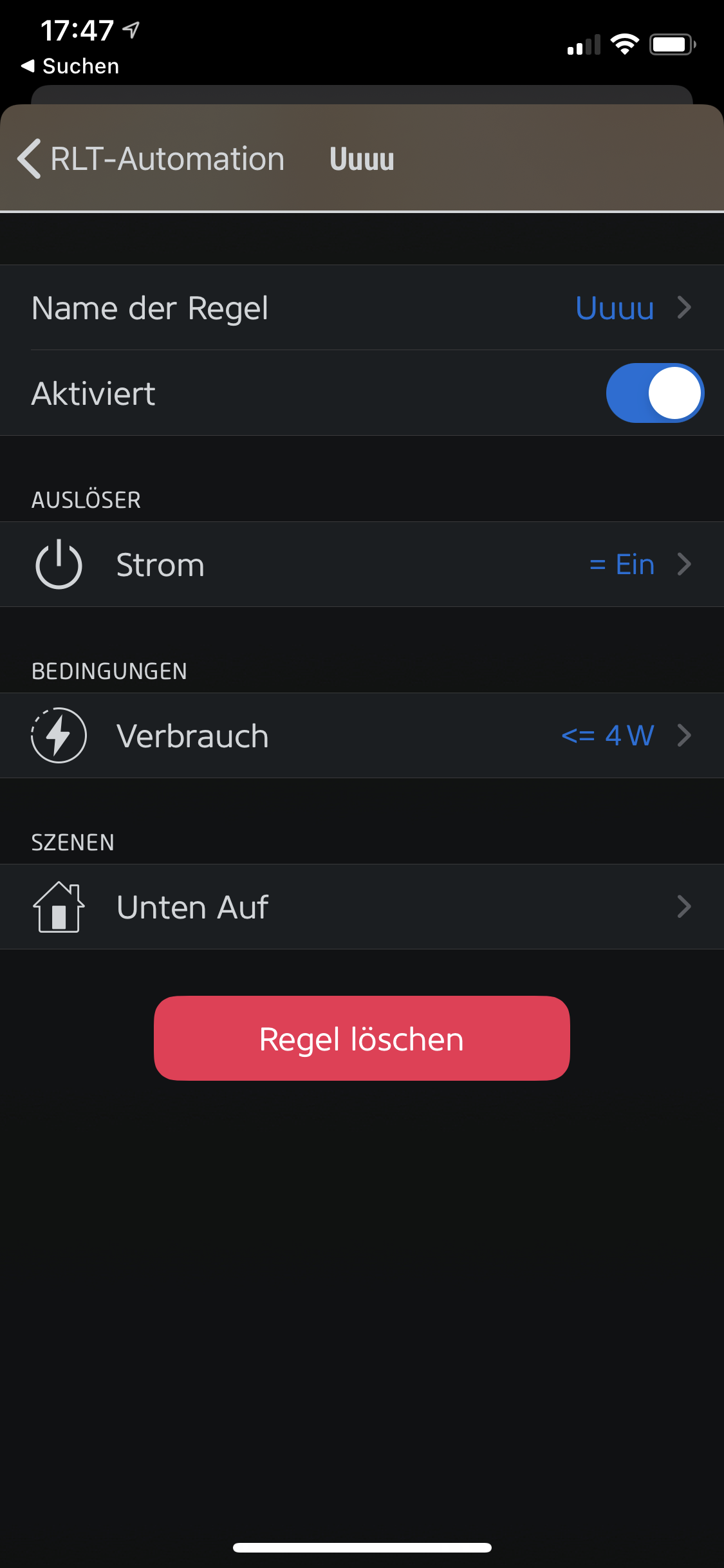 Leider funktioniert diese nur wenn der Auslöser (Strom EIN) und die Bedingung (Verbrauch unter 4W) quasi Zeitgleich ablaufen