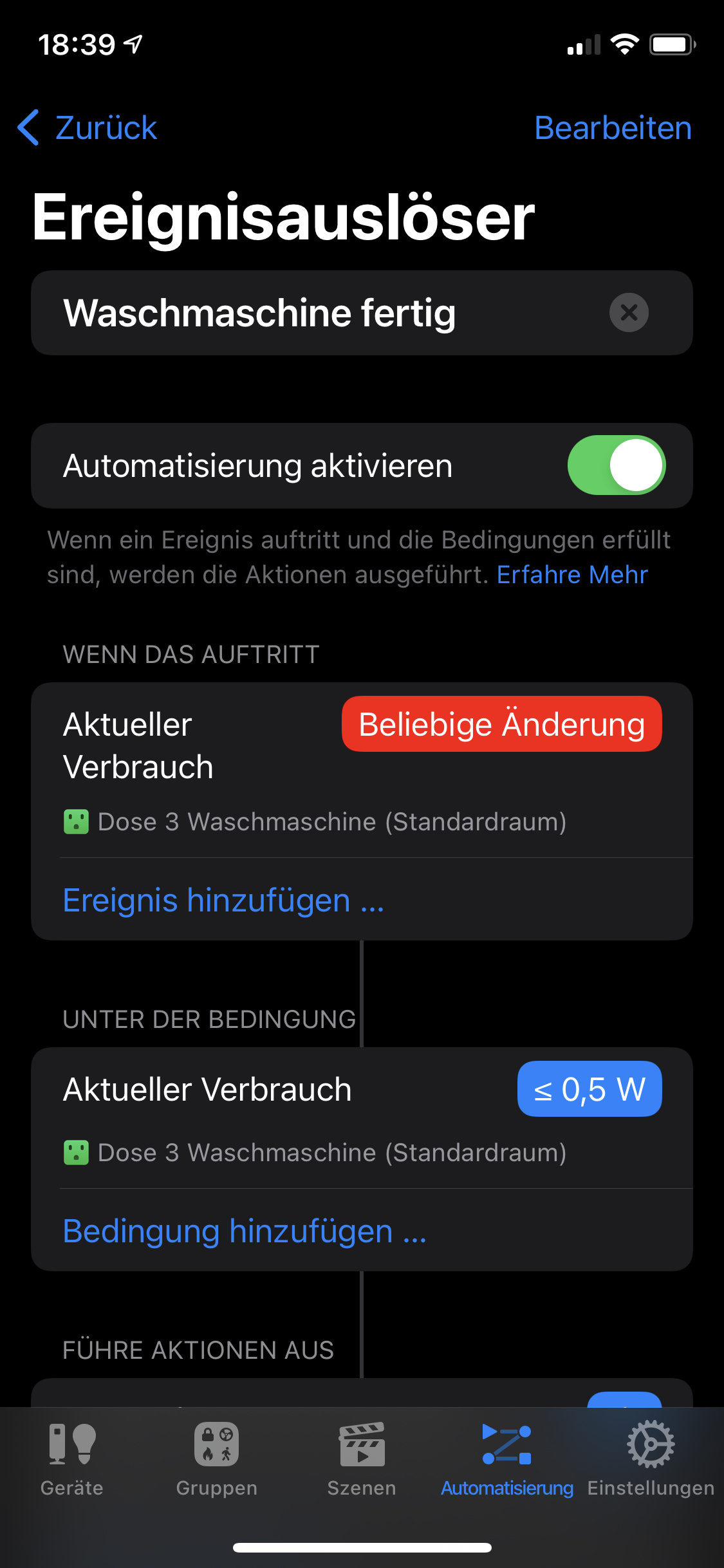 Mit folgender Automation funktioniert es theoretisch perfekt - die Aktion wird wirklich immer ausgeführt wenn die 0,5 Watt unterschritten werden .... leider macht meine hochmoderne Waschmaschine dies bei meinen ersten beiden Probeläufen gut 20 mal - in der folge habe ich natürlich 20 Benachrichtigungen das die Waschmaschine fertig ist.Ich bräuchte eine Weitere Bedingung z.B. unterschreiten von 0,5 Watt für 30 Sekunden dann wäre mein Problem erledigt. Leider finde ich dazu jetzt auch wieder nichts. Geschaltet wird ein Dummy Switch der wiederum direkte Benachrichtigungen an alle Handys sendet. Wo und wie kann ich den Faktor Zeit da mit einbinden?