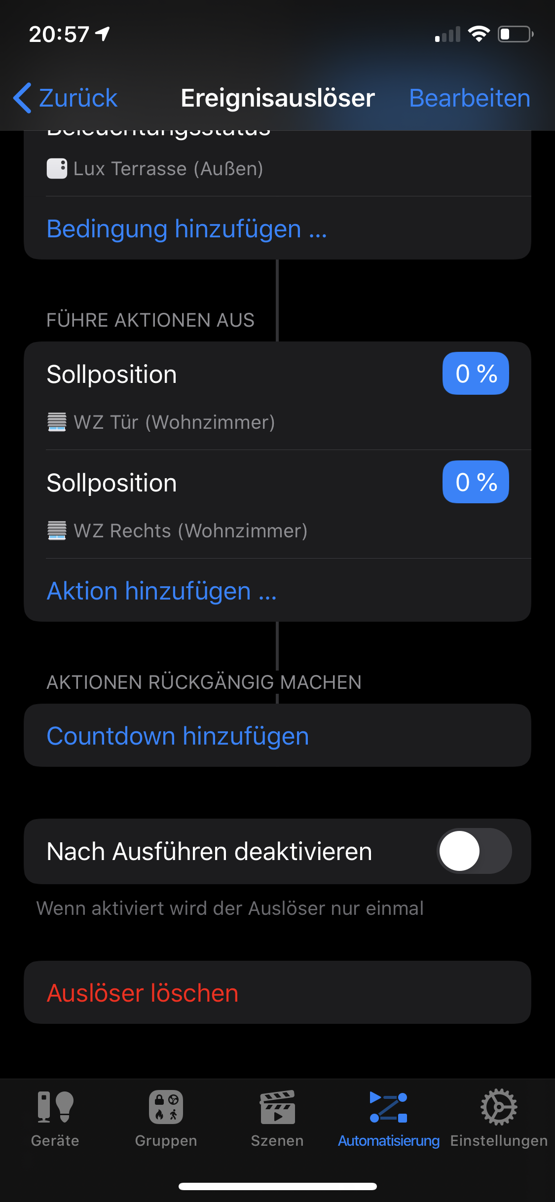 ich habe leider noch immer ein Problem mit meiner Rolladen Steuerung. Via Eve schließen die Rolladen Süd >=35000 LUX und schließen <=20000 LUX. Ich möchte aber nicht jede einzelne Wolke mitnehmen und hätte gerne 1-2 Minuten Zeitverzögerung vor der Ausführung - ist das vielleicht irgendwie möglich z.B. mit Kurzbefehl?
