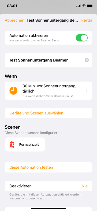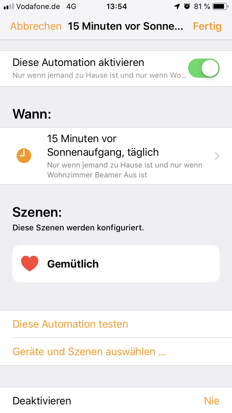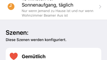 Beispiel (3): Wir haben einen Beamer als TV, der auch gerne mal am frühen Abend eingeschaltet ist und an einer smarten Steckdose hängt. Sobald es dunkel wird (Sonnenuntergang) und der Beamer an ist, soll eine spezielle Szene mit gemütlichem TV-Licht angeschaltet werden. Da das aus unerfindlichen Gründen ja nicht nativ über HomeKit geht, nutze ich die App Controller. Seit dem neusten Update scheint aber auch da nichts mehr wie gewohnt zu funktionieren.