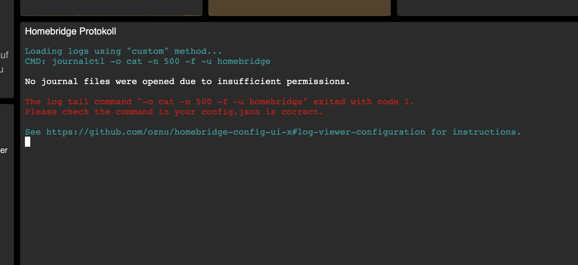 The log tail command "-n journalctl -o cat -n 500 -f -u homebridge" exited with code 1.