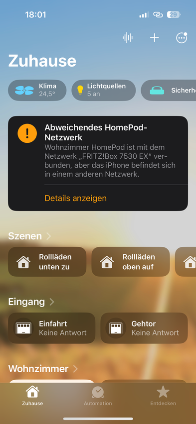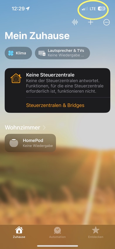 Ab da zeigt Home alle WLAN Geräte als nicht erreichbar an, alle Steuerzentralen als nicht erreichbar und nur die Bluetooth Geräte kann ich noch steuern.