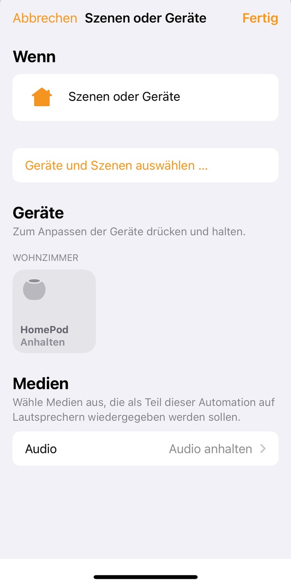 Der HomePod spielt deine Szene ab, dafür stellst du die entsprechende Zeit in Sekunden ein und erstellt dann noch einen Eintrag der den HomePod wieder anhält.