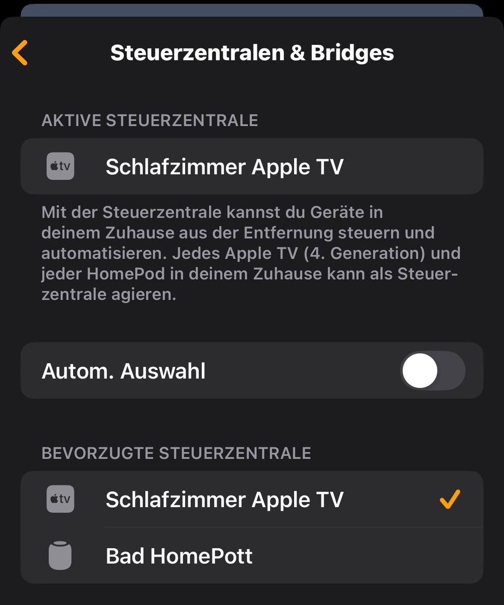 Hier hat es geholfen. Nach dem gestrigen Update aller Geräte zeigte sich noch keine Veränderung unter "Steuerzentralen & Bridges". Auch half es nicht, eine Nacht zu warten - also wurde der HomePod und der ATV heute entstöpselt. Nach dem Kaltstart des ATV war die Option "Autom. Auswahl" dann sichtbar. Mit deren Abwahl erschien der ATV zuzüglich eines Hakens. Danach hab ich den HomePod (es gab tatsächlich noch ein Update für die alte Urne) ebenfalls kalt gestartet und er wurde sofort ohne Haken unter dem ATV gelistet.