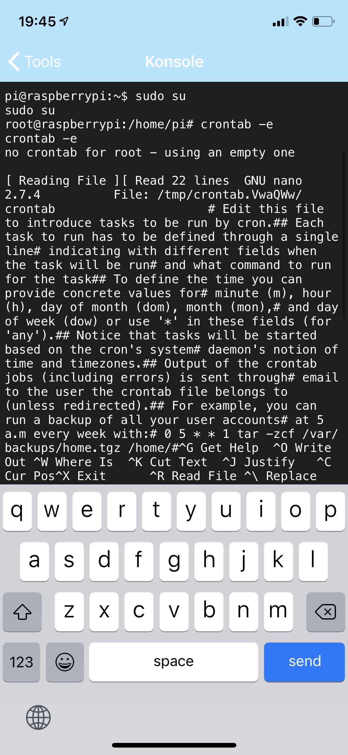 Bin normal als Root drinnen und verwende den Befehl crontab -e