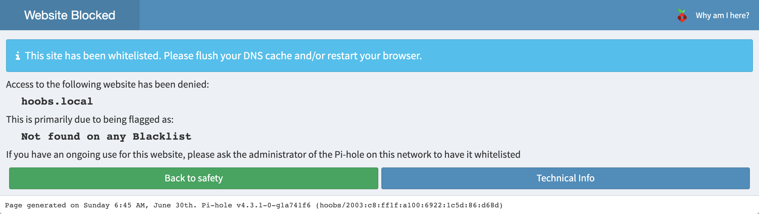 Ich habe Homebridge und pi hole auf meinem Raspy installiert und würde gerne beide Web UI's aufrufen können. Leider lässt sich mit der ip des Raspy aber nur das admin interface von pihole aufrufen. Wenn ich versuche das Web UI des Homebridge aufzurufen (mit hoobs.local) bekomme ich eine Fehlermeldung "acces to the following website has been denied", obwohl es (hoobs.local) auf der whitelist ist.