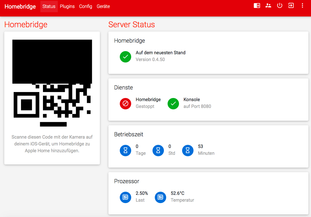 Es hat alles Reibung los geklappt. Jetzt wollte ich den mir im Webinterface angezeigten Qr Code scannen um die Homebridge in Homekit zu integrieren. Das iPhone scheint auch etwas zu erkennen und will sich verbinden, aber das klappt nicht.