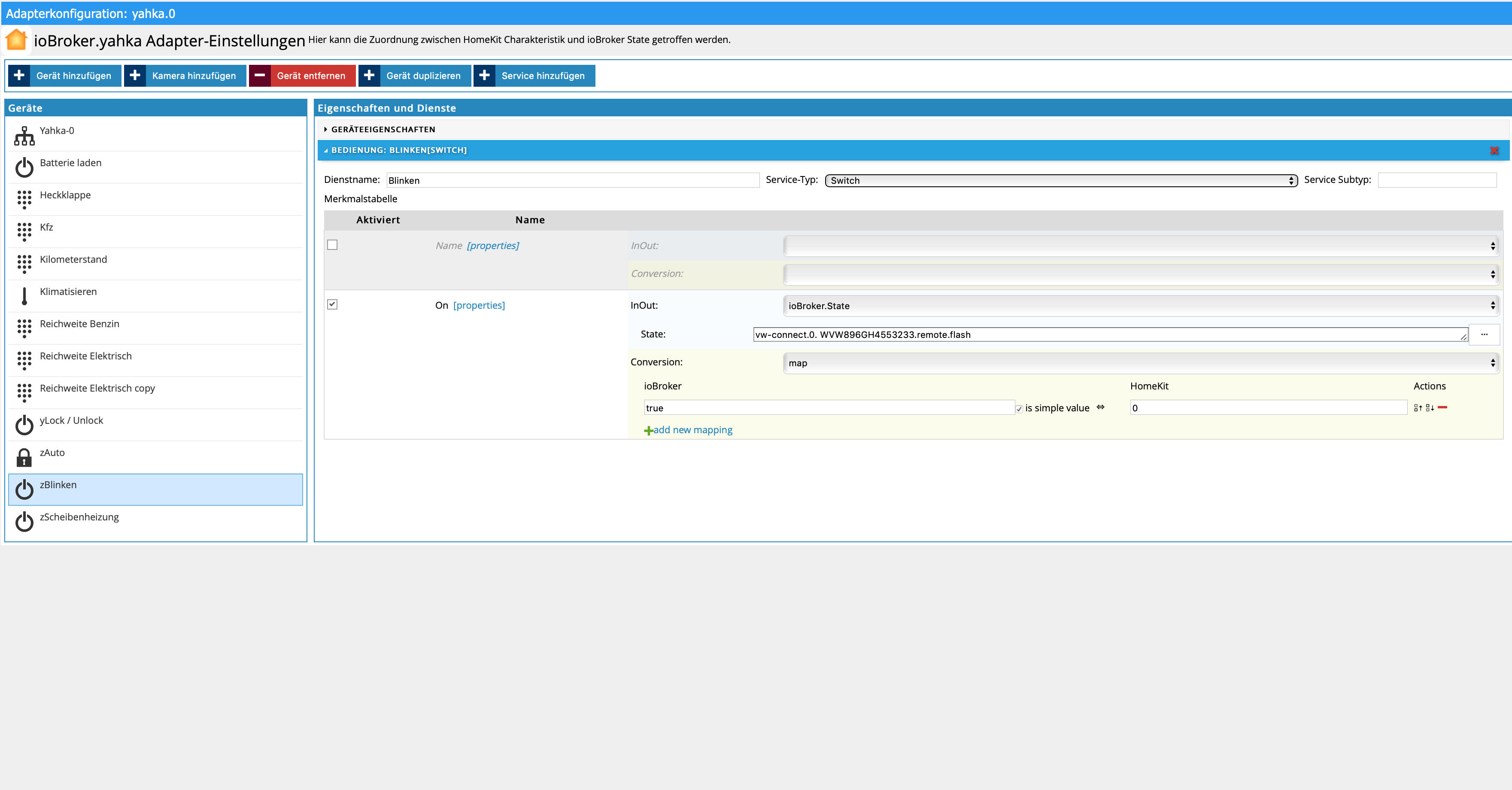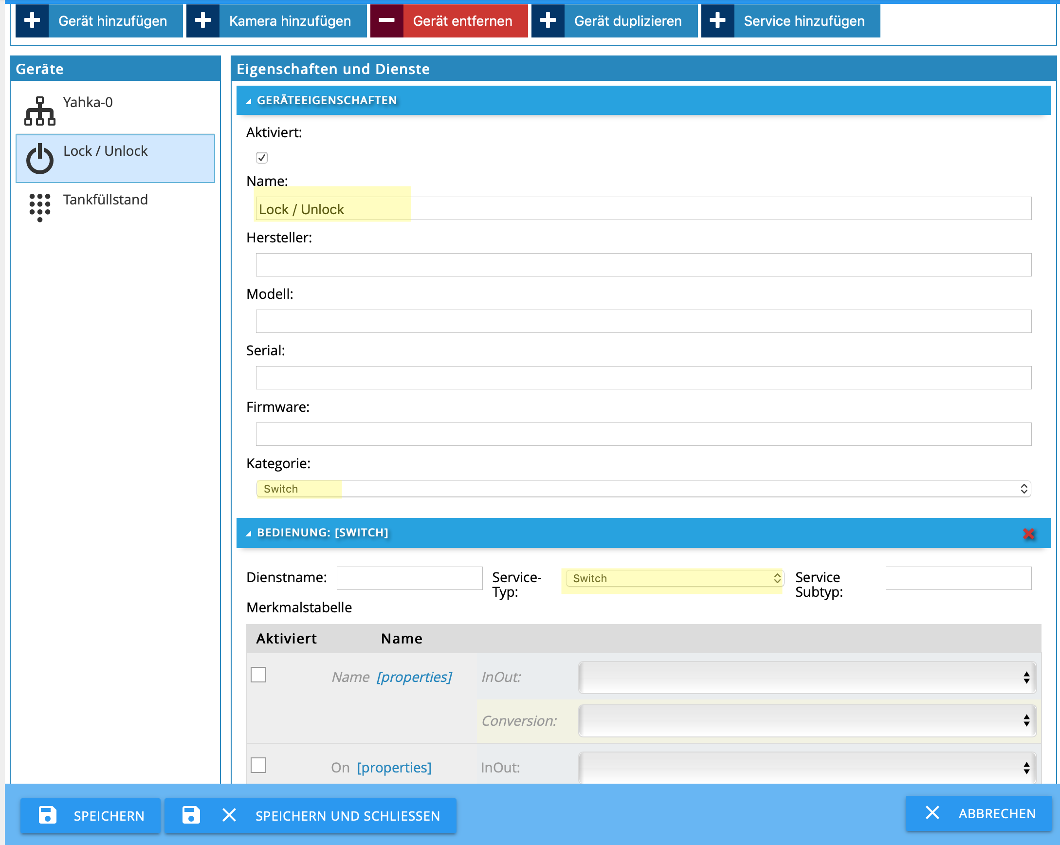 In Yahka erstellt man dann seinen Schalter bzw. seine Sensoren (Gerät und Dienst). Ich liste mal auf, als was ich diese erstellt habe.