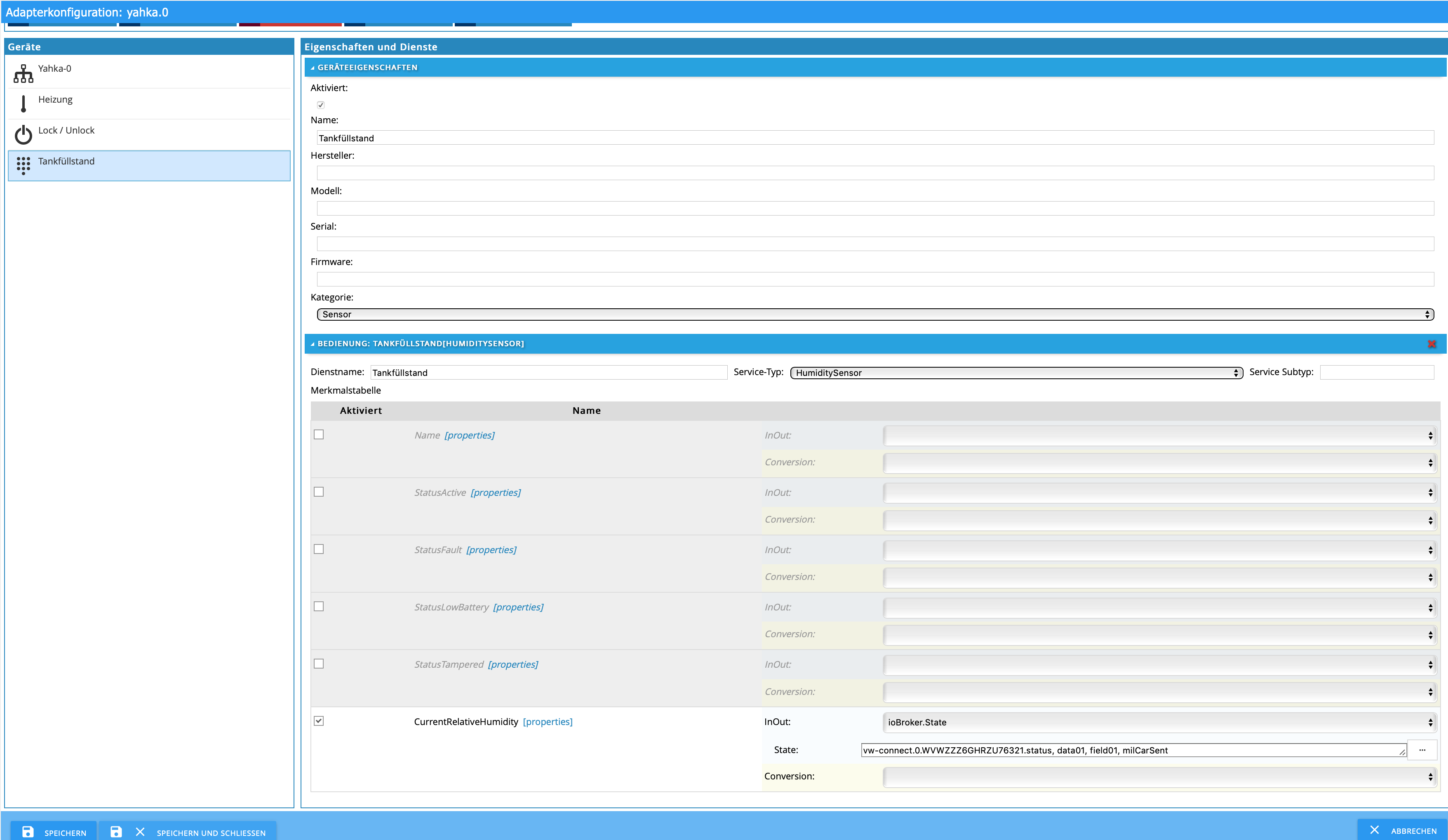 Tankfüllstand - Feuchtigkeitssensor - in ioBroker unter VIN, status, data07, field09, value