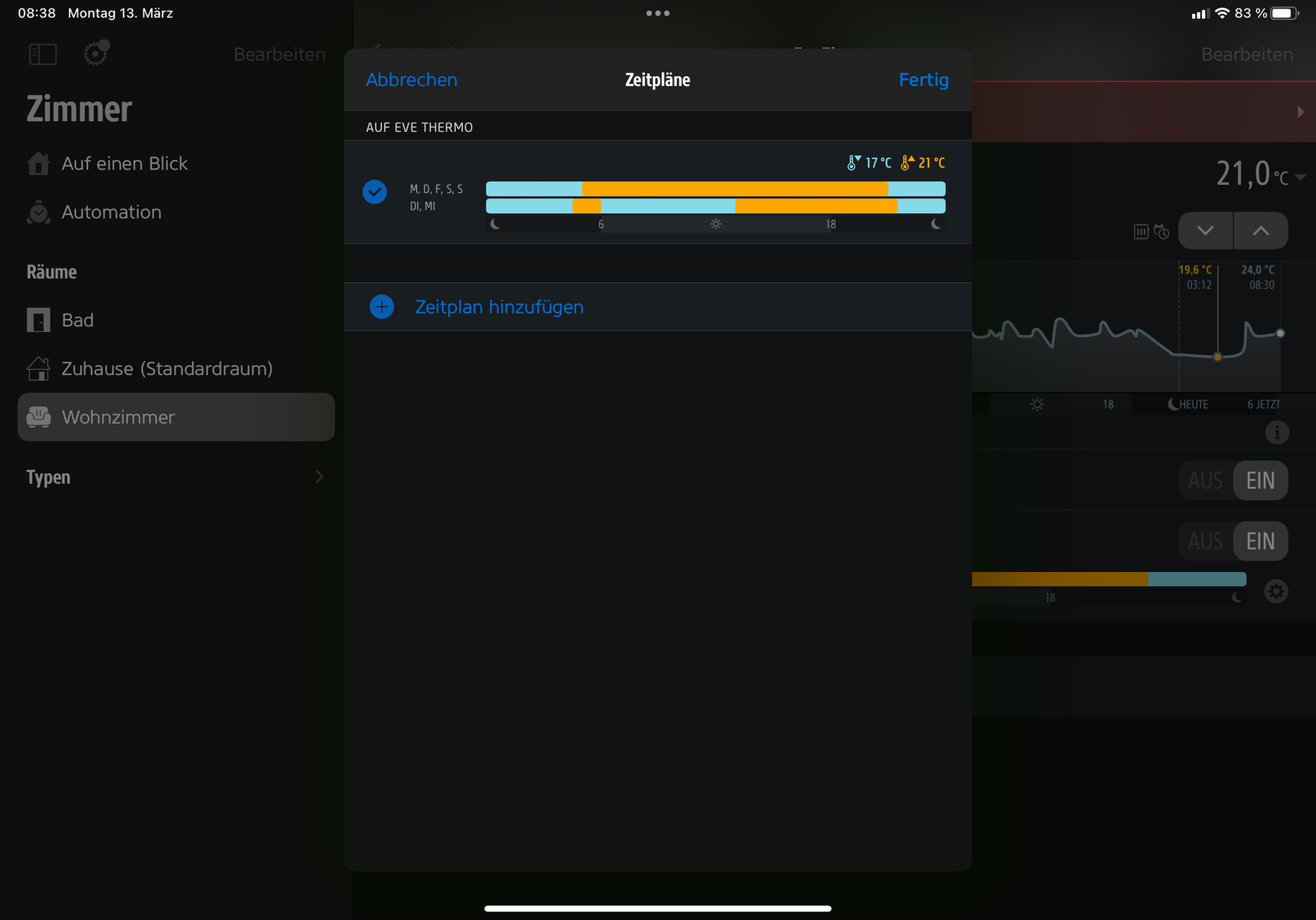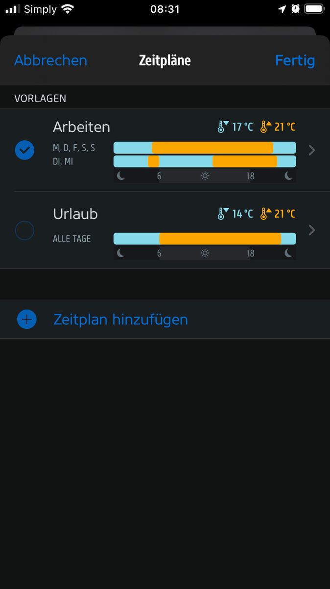 Funktioniert auch nur leider sehe ich die Zeitpläne nicht auf dem Ipad. Sehe auf dem ipad das er ein Zeitplan aktiviert hat nur leider kann ich auf dem ipad nicht zwischen den beiden Zeitplänen wählen. Als würde kein Sync zwischen beiden Geräten und App stattfinden.