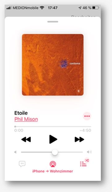 In der Musik-App sieht es dann folgendermaßen aus (Text „iPhone -> Wohnzimmer“) (siehe Anhang Screen4)