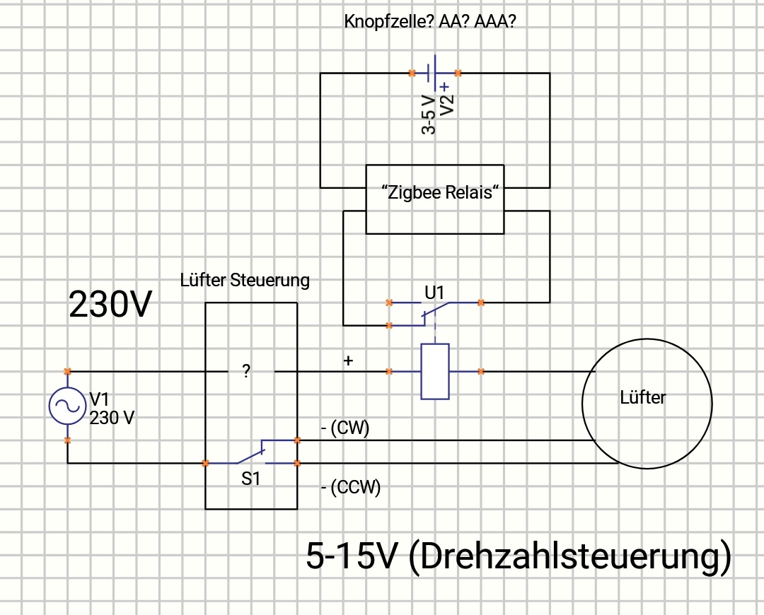 Direkt am Lüfter (Schlafzimmer, ca 15 m entfernt) habe ich kein 230V, lediglich die zwei N Leiter und 5-15V DC. Also keine sinnvolle Möglichkeit das Relais mit Strom zu versorgen.