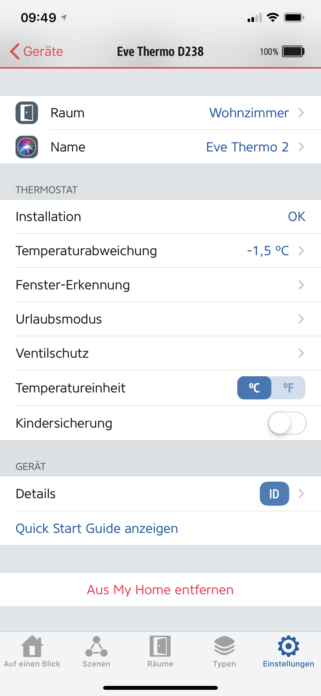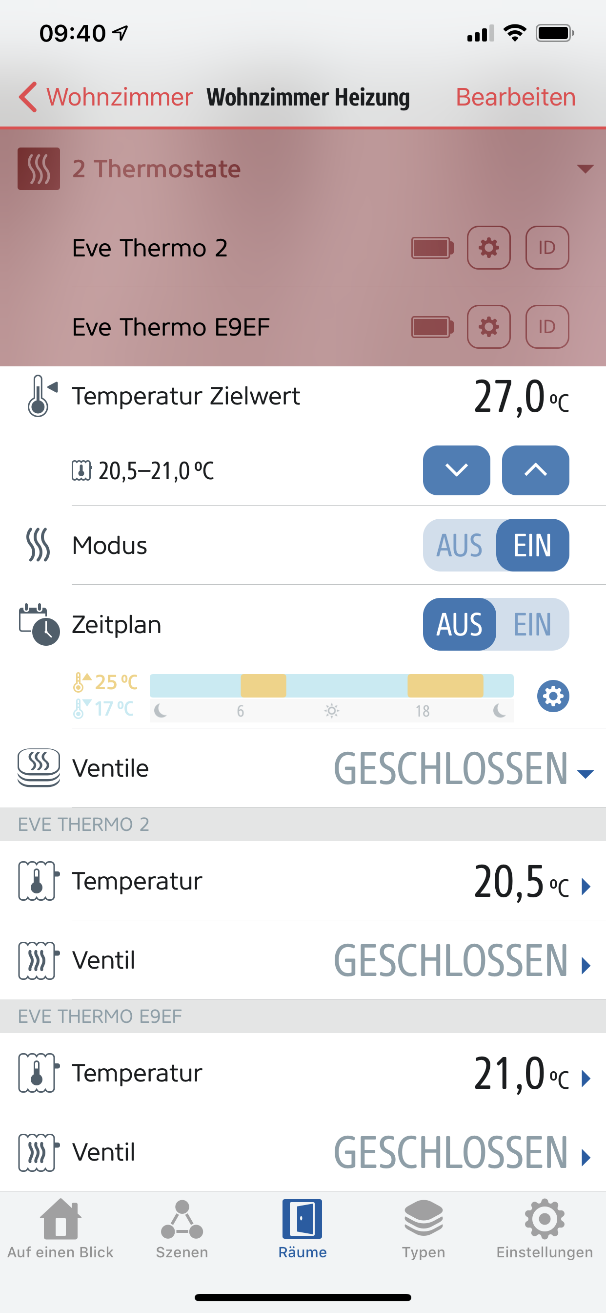 Die Thermostate stehen auf 30 - über die App, HomeKit und direkt am Thermostat - die Werte übernimmt er auf jeden Fall. Der Offset ist bei -1,5 - bei 21 Grad Raumtemperatur - sollte es das Thermostat also auf jeden Fall triggern - tut es leider nur nicht.