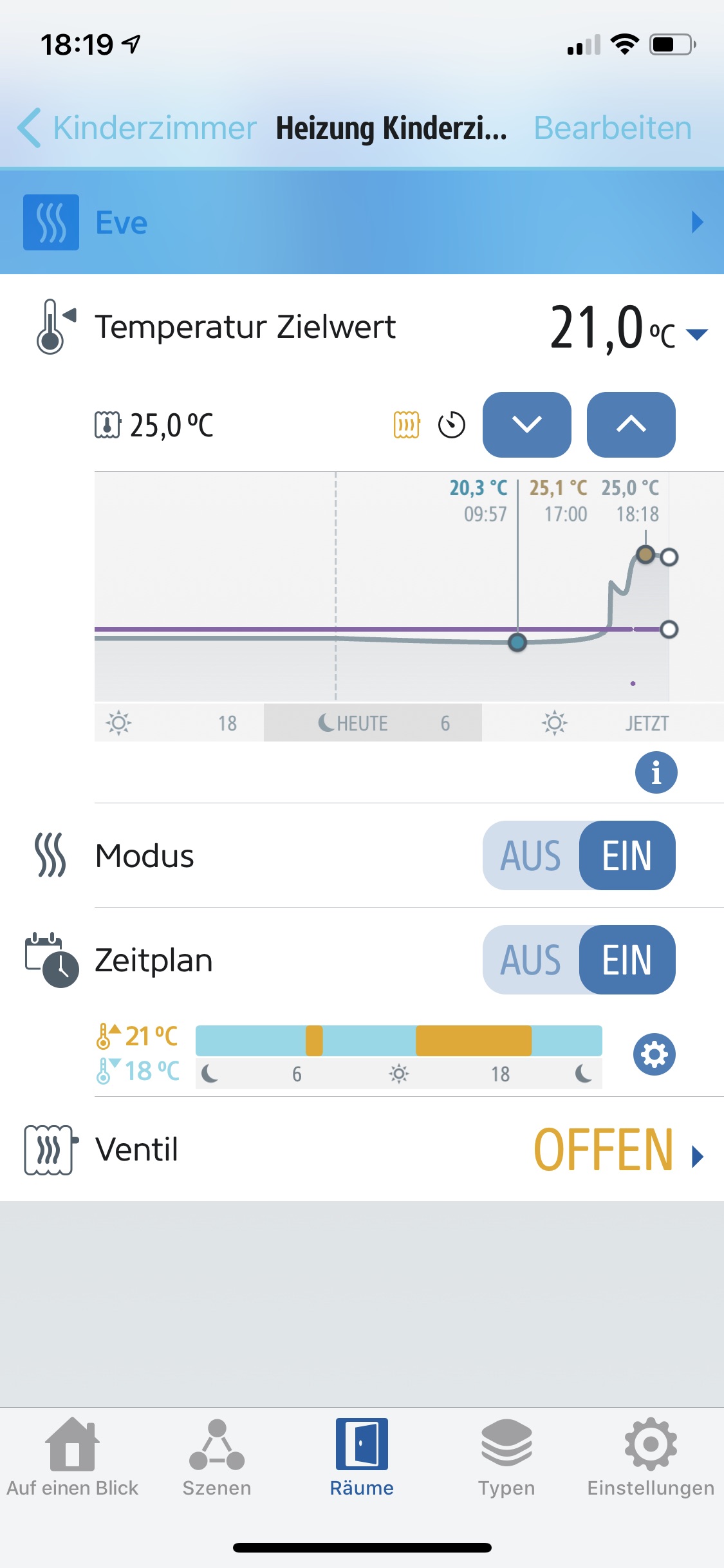 Ich möchte 21 Grad im Zimmer haben(zielwert), Die app zeigt mir als aktuelle Temperatur 25Grad. Abweichung habe ich auf -2,5 gestellt und die aktuelle Zimmertemperatur ist 22Grad.