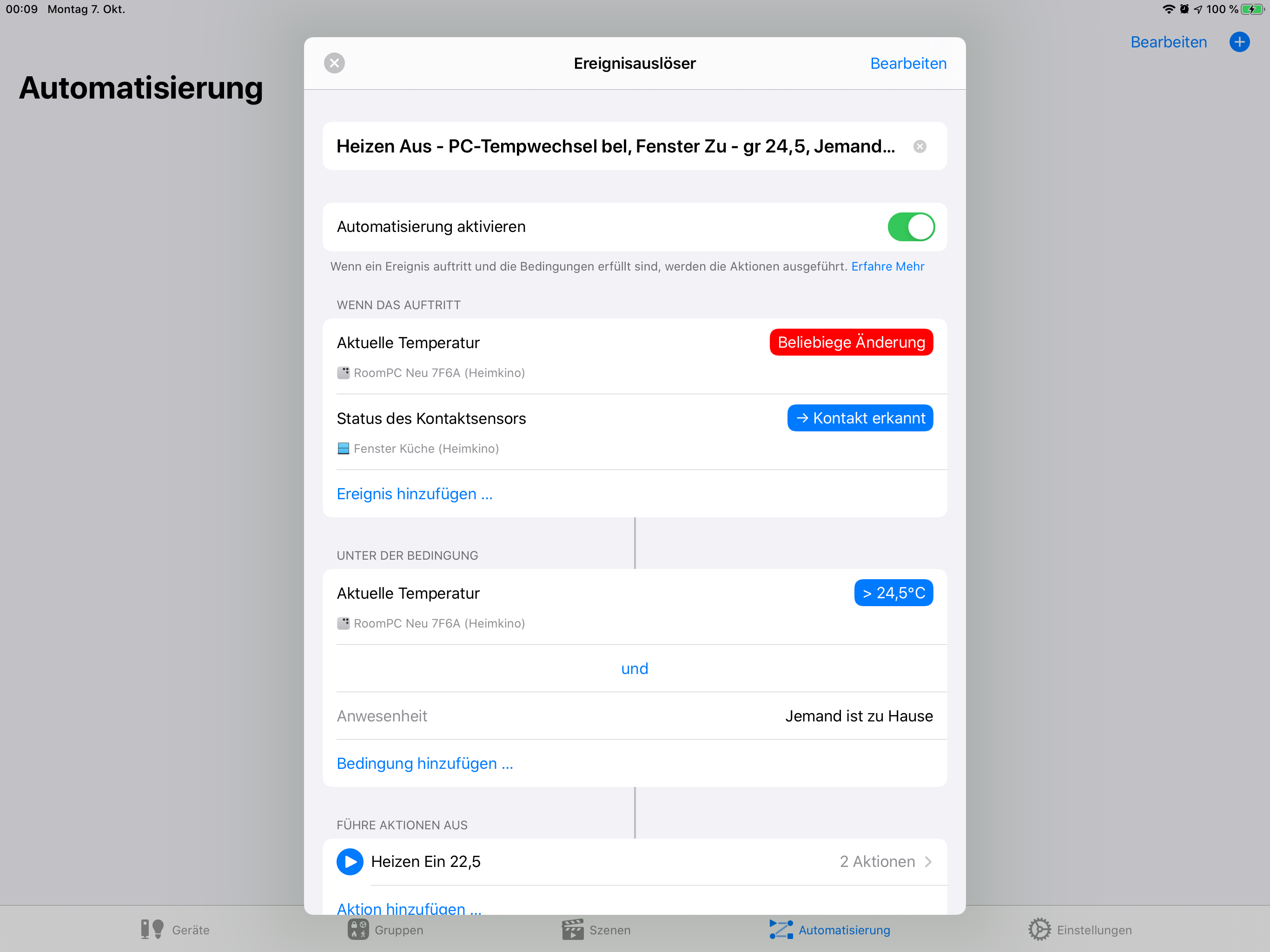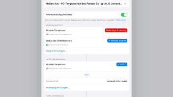Das Zeitaufwendigste bei den Recherchen war, dass fast alle Apps hinsichtlich dieser Automatisierung keinen geeigneten Funktionsumfang liefern, auch nicht die Eve-App. Einzig hatte mich die App "Home+ 4" überzeugen können, hier können Auslöser, Bedingungen und Szenen übersichtlich und intuitiv kombiniert werden.