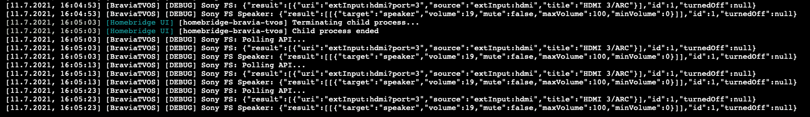 Jul 10 14:12:17 hbridge3 homebridge[26324]: [10.7.2021, 14:12:17] [BraviaTVOS] [DEBUG] Sony FS: Polling API...