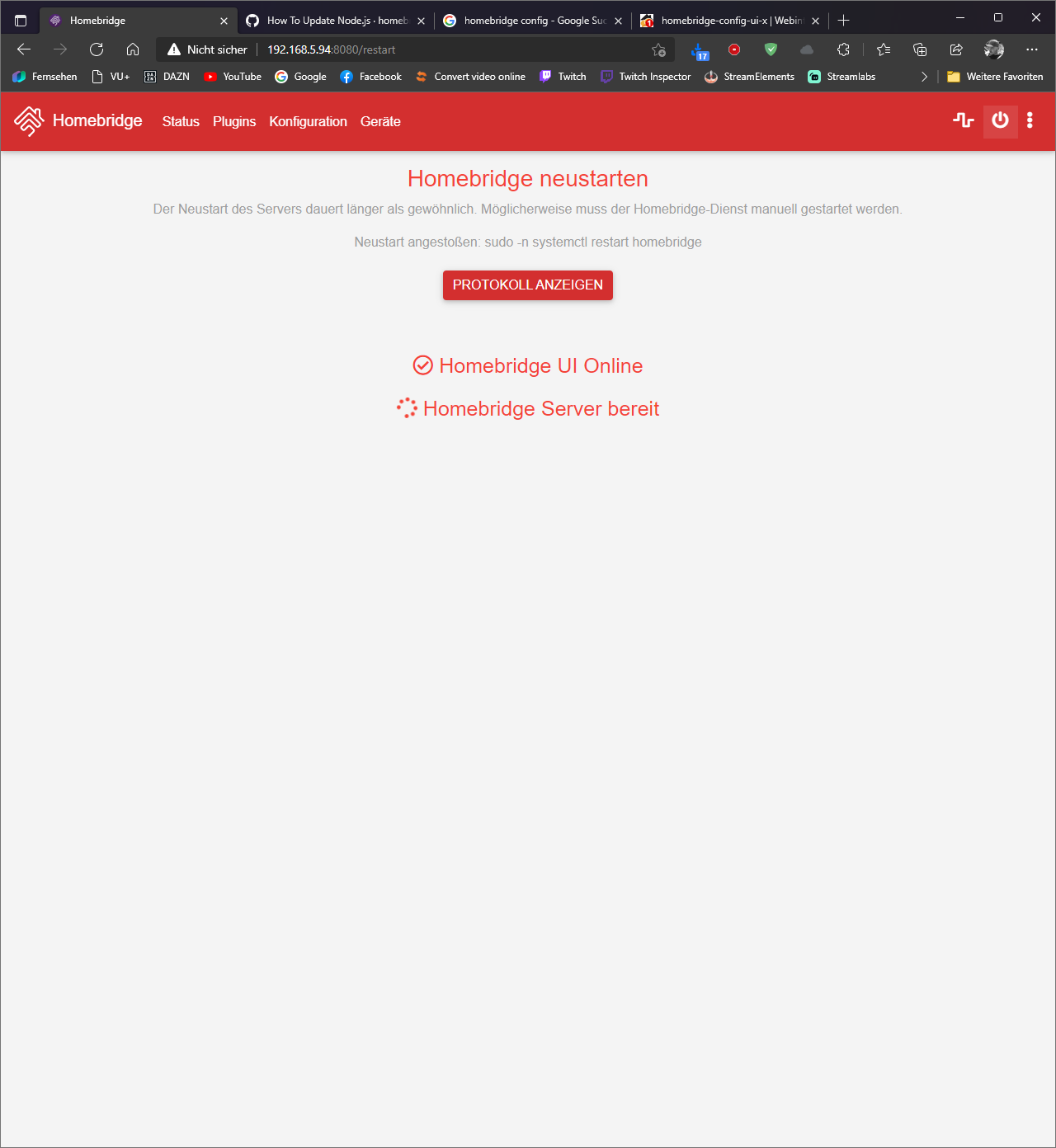 Die Geräte waren allesamt nicht mehr in Homekit erreichbar. Daraufhin wollte ich die Bridge neu starten und das dauert lange. Wie aufg dem bild zu sehen. Danach habe ich alle Updates gemacht (Plugins und Bridge und Node) und dennoch kommt das obige Bild.