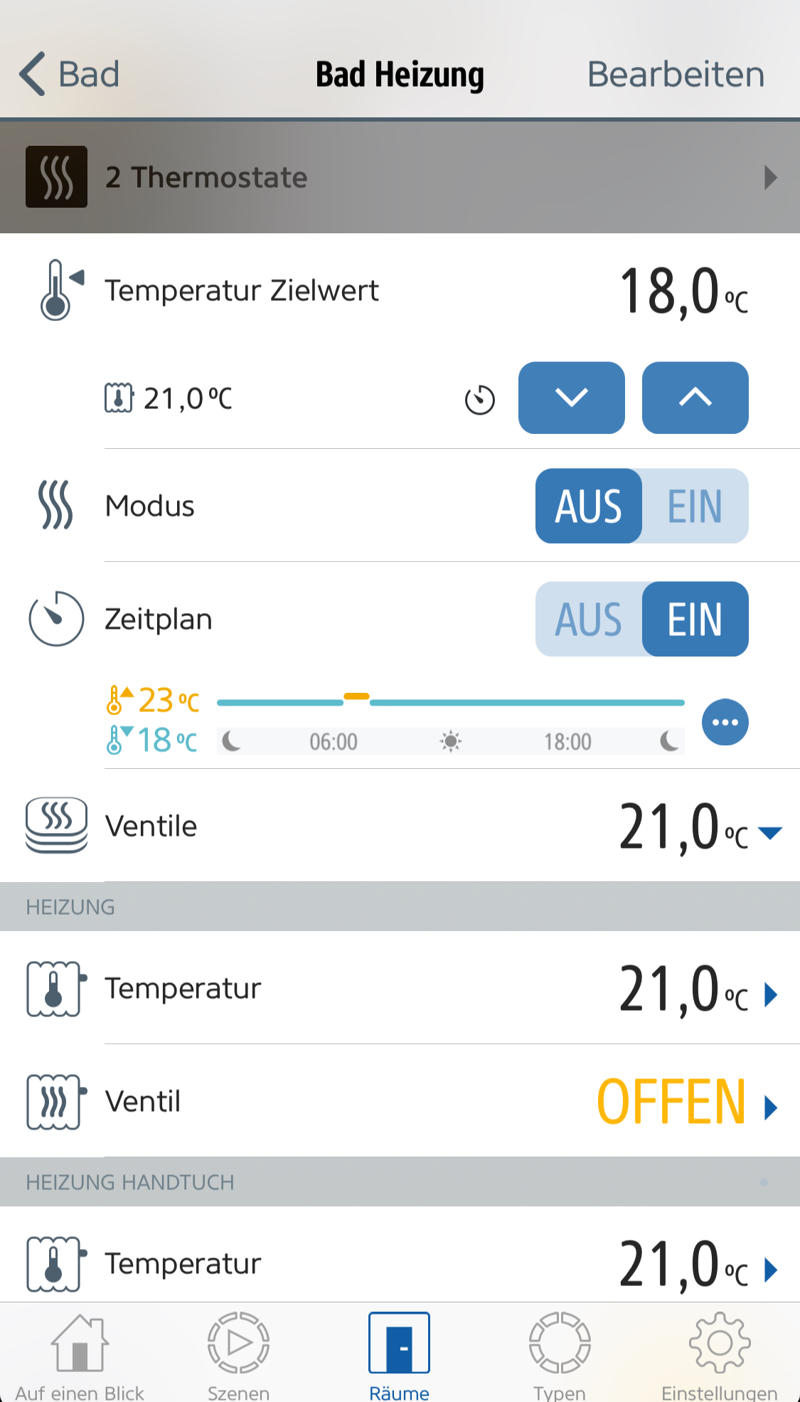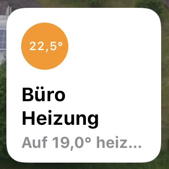 Wenn die Temperatur erreicht ist geht die Farbanzeige in der Home App von orange (heizen) zu grün (Temp. erreicht also Ventil zu) über. Grau bedeutet Modus aus.