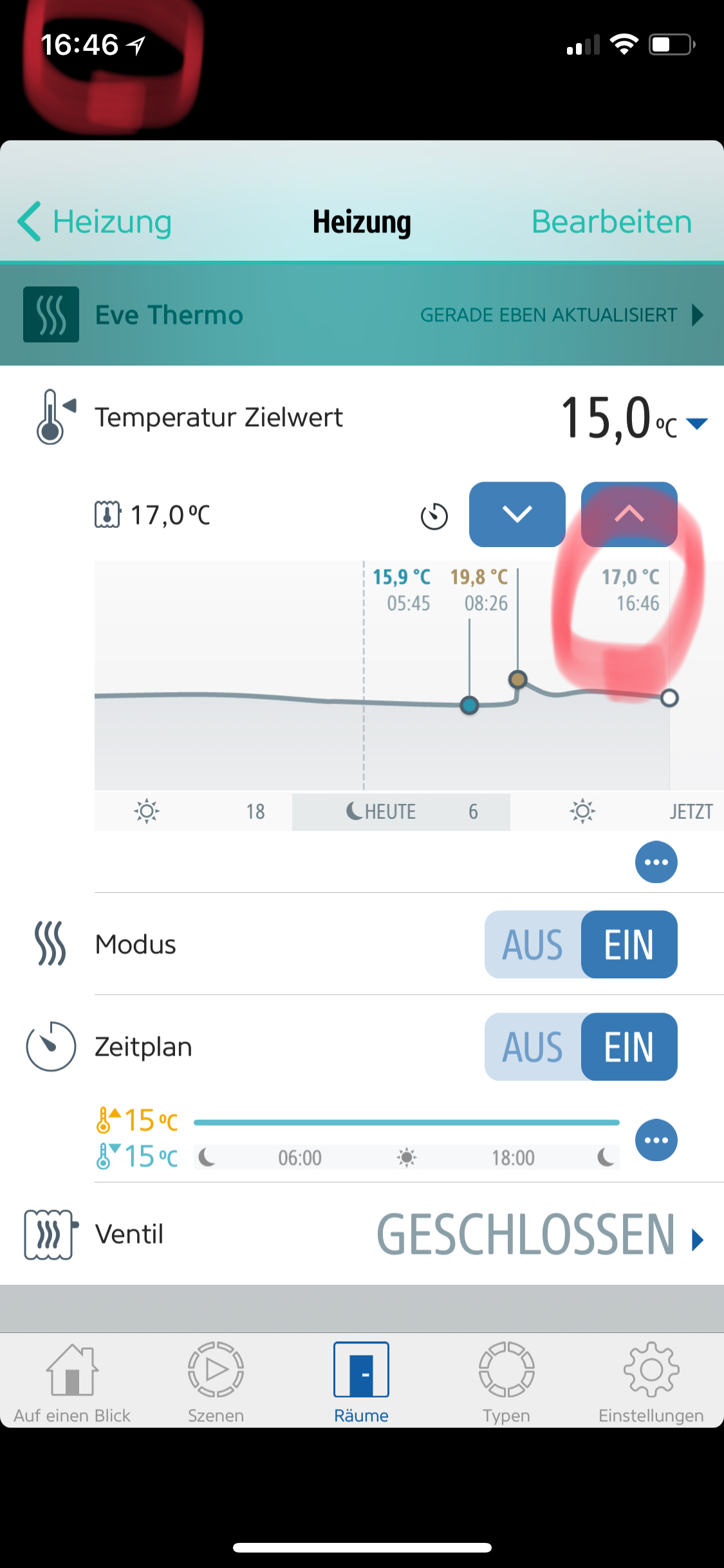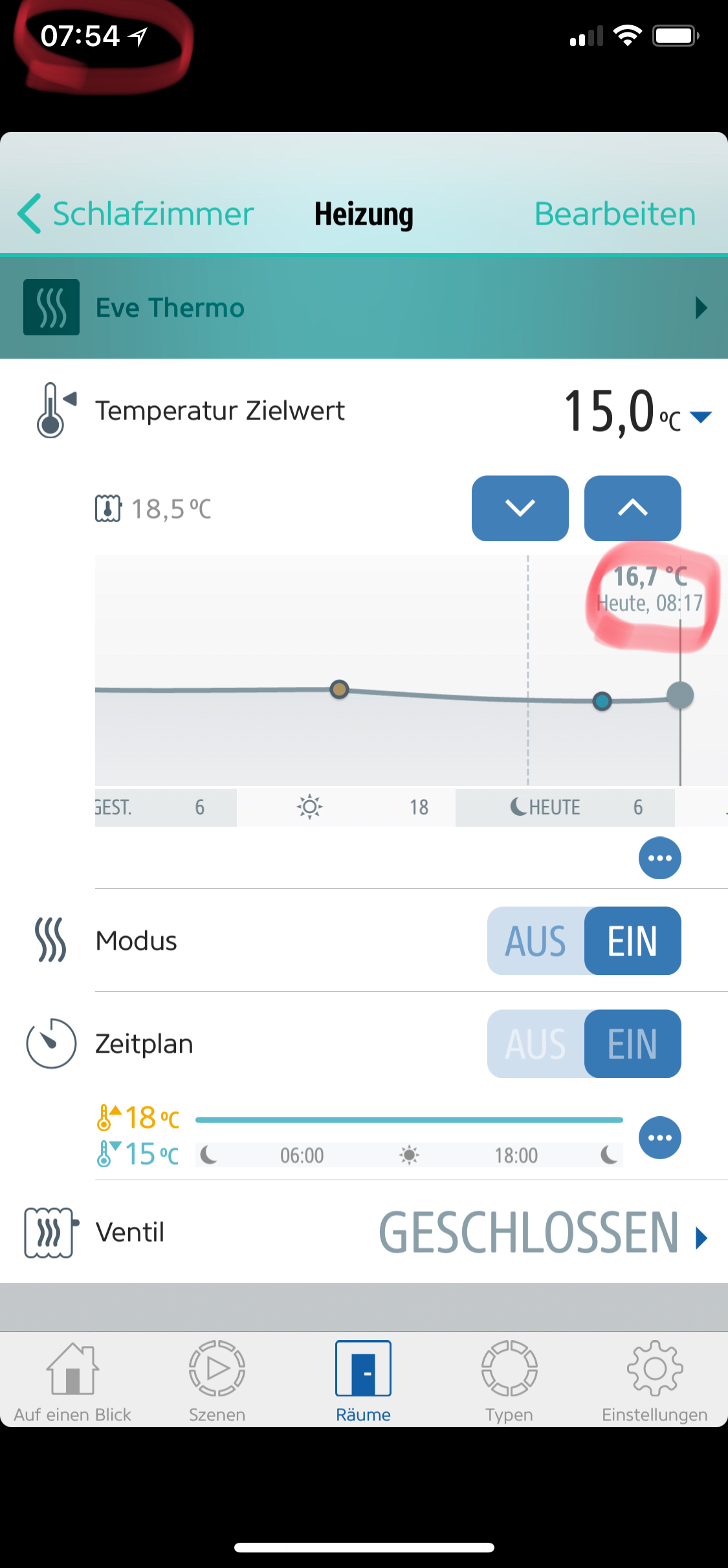 Ich hatte es selbst so definiert und habe jetzt auf eine Steuerung über Temperatur und Zeitplan aus umgestellt.Was mich aber bei den Thermos am meisten stört - die fehlende Möglichkeit, ein Eve Degree/Weather/Room als Ist-Temperatur anzugeben.