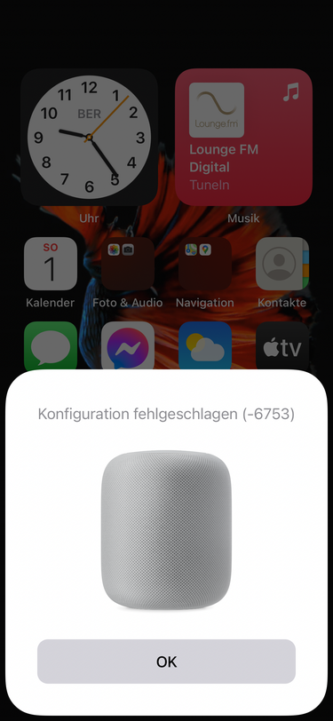 Jetzt fangen die Probleme an. Ich kann die HomePods (habe alle probiert) nicht mehr einbinden. Den Fehlercode (-6753) finde ich nicht im Netz und hier unter den Chats zu Homebrigdes und HomePod finde ich keine Hinweise.