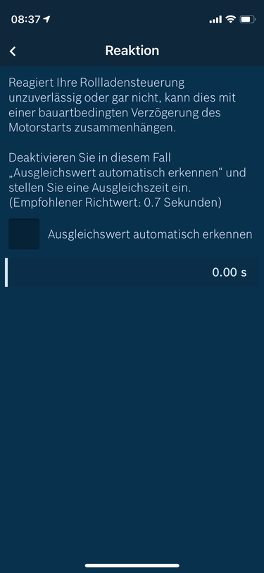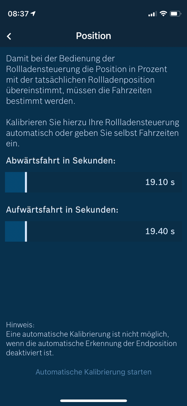 Ein kleiner Manko ist aber die Kalibrierung. Es gibt einen automatischen Mode (der bei allen Rollos dazu führt, dass das Rollo zu 80% schließt, wenn ich in den Apps 50% einstelle) und im manuellen Mode kann man die Fahrzeiten und Verzögerung einstellen. Beides schafft keine Abhilfe und mit erschließen sich die verschiedenen Einstellungen nicht. Das deaktivieren der automatischen Kalibrierung und das Herumspielen an den Werten macht die Abweichung zwischen eingestelltem Wert und dem, was die Steuerung dann einstellt noch größer.