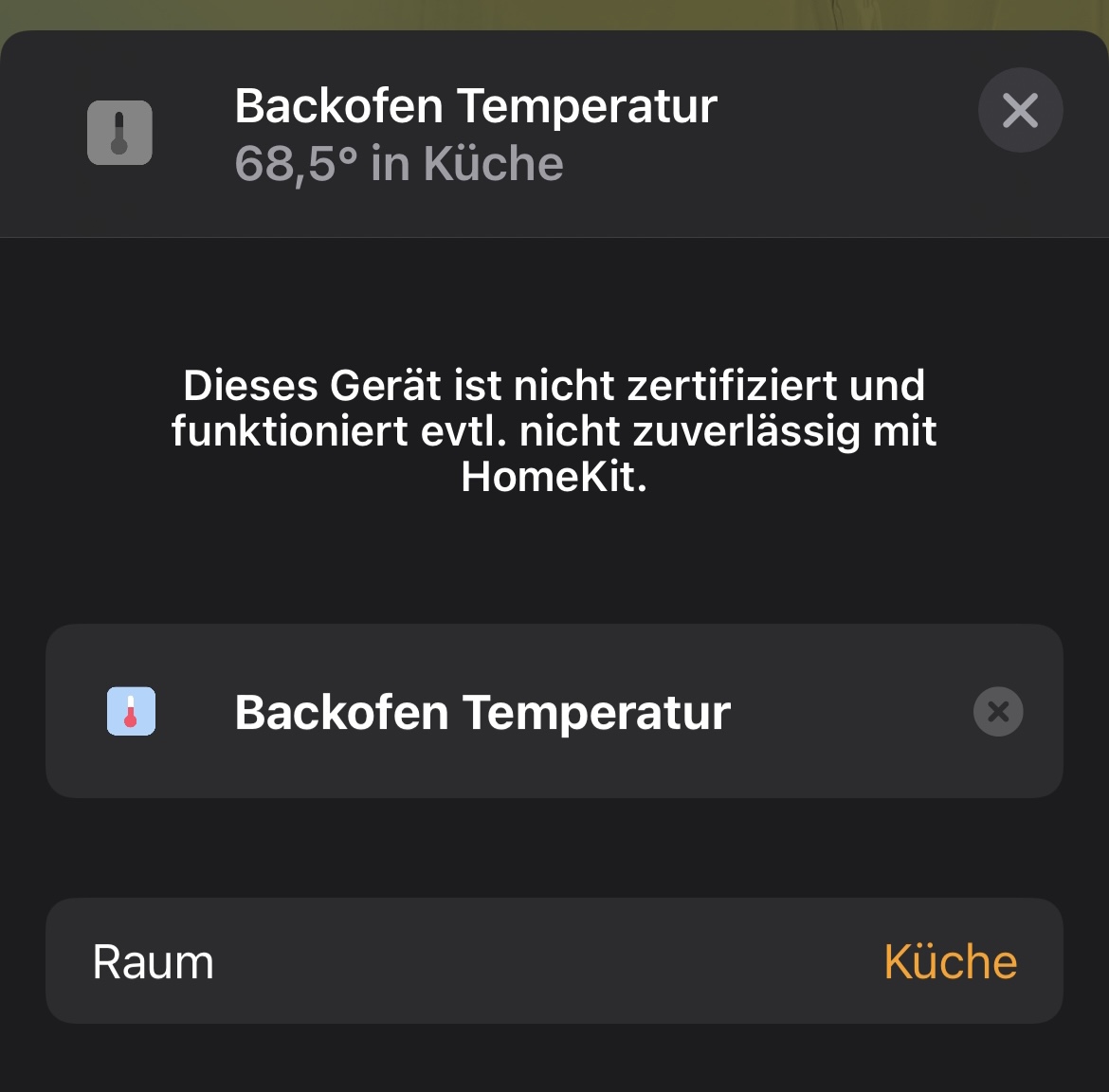 Homebridge Neustarten und dann erscheint schon der Temperatursensor in Homekit.