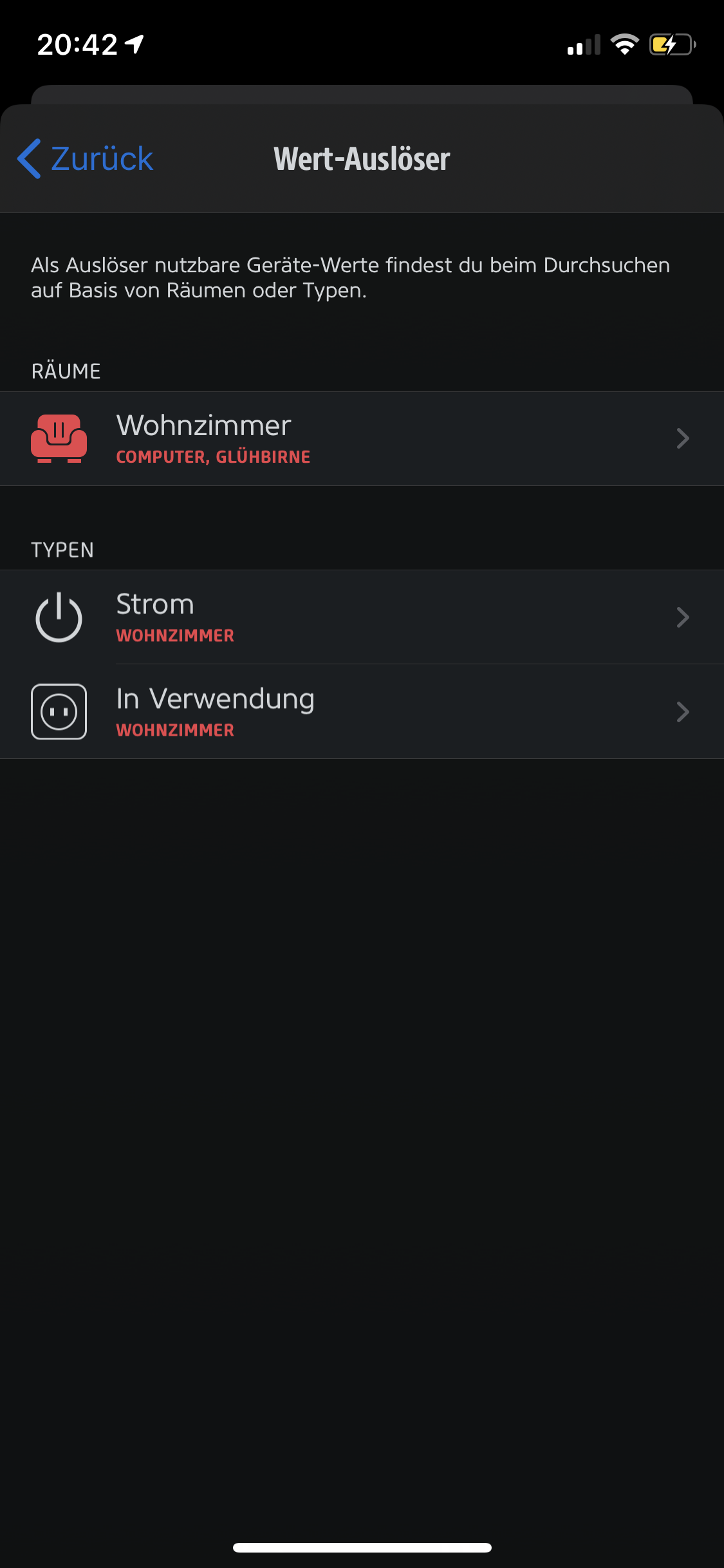 Wenn ich den Verbrauch als Auslöser einstellen könnte jedoch geht das bei eve in der App nicht. Man hat nur die Option Ein/Aus obwohl der Menüpunkt Wert-Auslöser vorhanden ist.