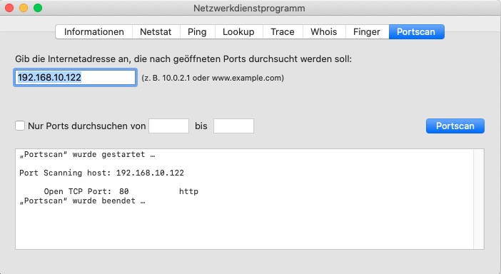 Manchmal kommt man echt nicht auf die einfachsten Dinge. macOS hat im Standard einen Portscanner ... es ist Port 80