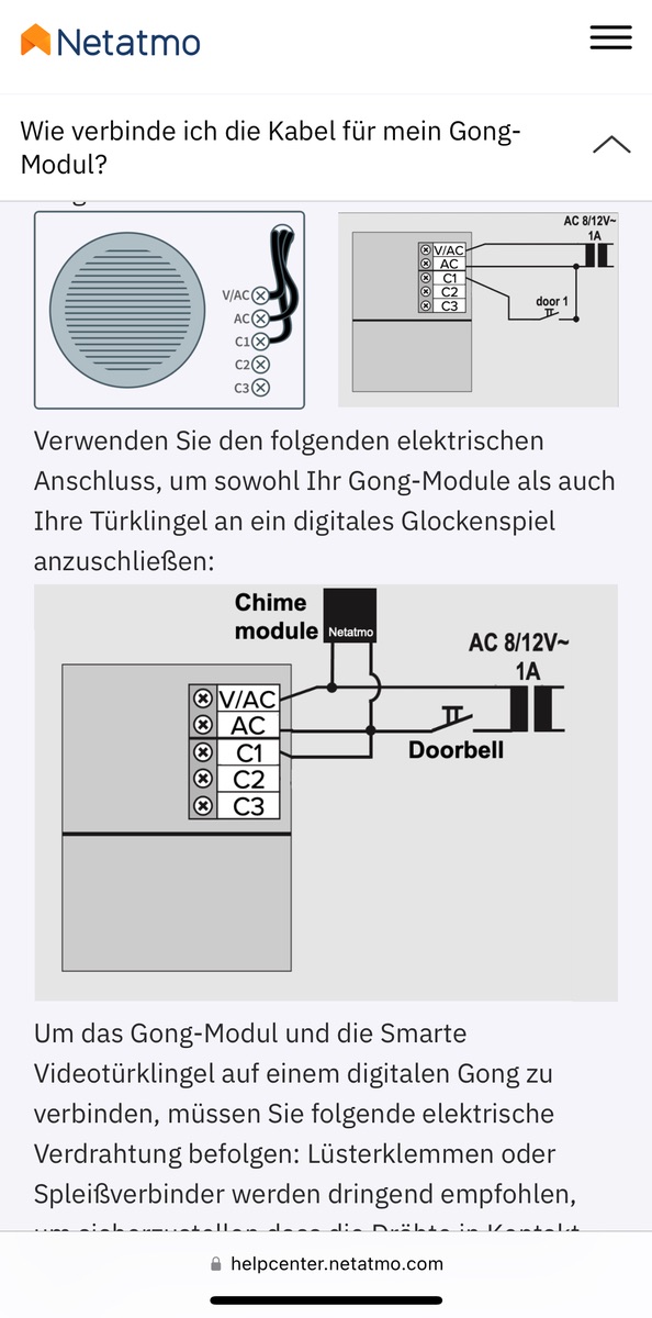 Update: Also mit der Chroma funktioniert es so wie auf dem Schaltbild von Netatmo mitgegeben. Allerdings konnte ich die Klingel (obwohl grüne LED dauerhaft leuchtet) nicht in HomeKit oder die Netatmo Security app einbinden. Es gibt immer einen Fehler wo er sagt "Um das Gerät hinzuzufügen muss es erst zurückgesetzt werden". Das Zurücksetzen klappt leider nicht zu 100%. Bin jetzt mit dem Netatmo support in Kontakt. Melde mich