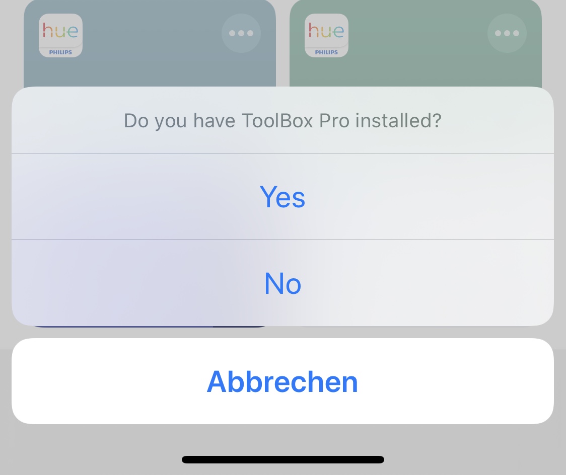 Das kommt, wenn man den Kurzbefehl durchlaufen lässt. Da kommt die Abfrage: "Hast Du Toolbox Pro installiert", Ja / Nein.