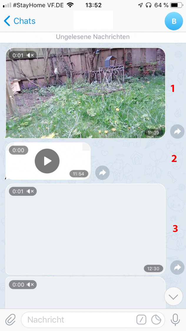 Ziffer 2 im Screen - bekomme ich hingegen sehr häufig. Erst nach einem Download wird mir der Play-Button in Telegram gezeigt. Der wiederum öffnet den Player und das Video ist einfach nur schwarz. Erst wenn ich das Video in den Aufnahmen meines iPhones speichere und mir dann aus der Fotomediathek anschaue, sehe ich etwas.