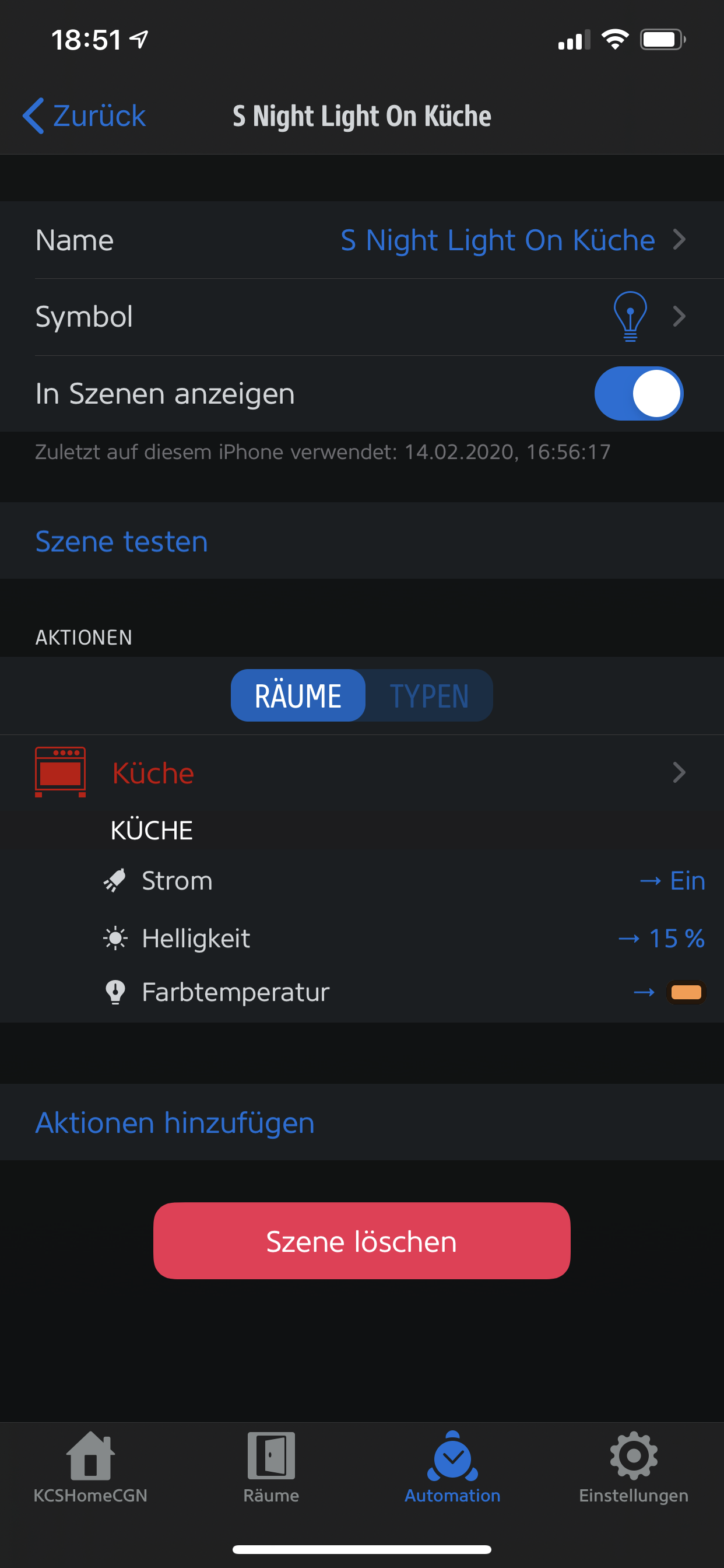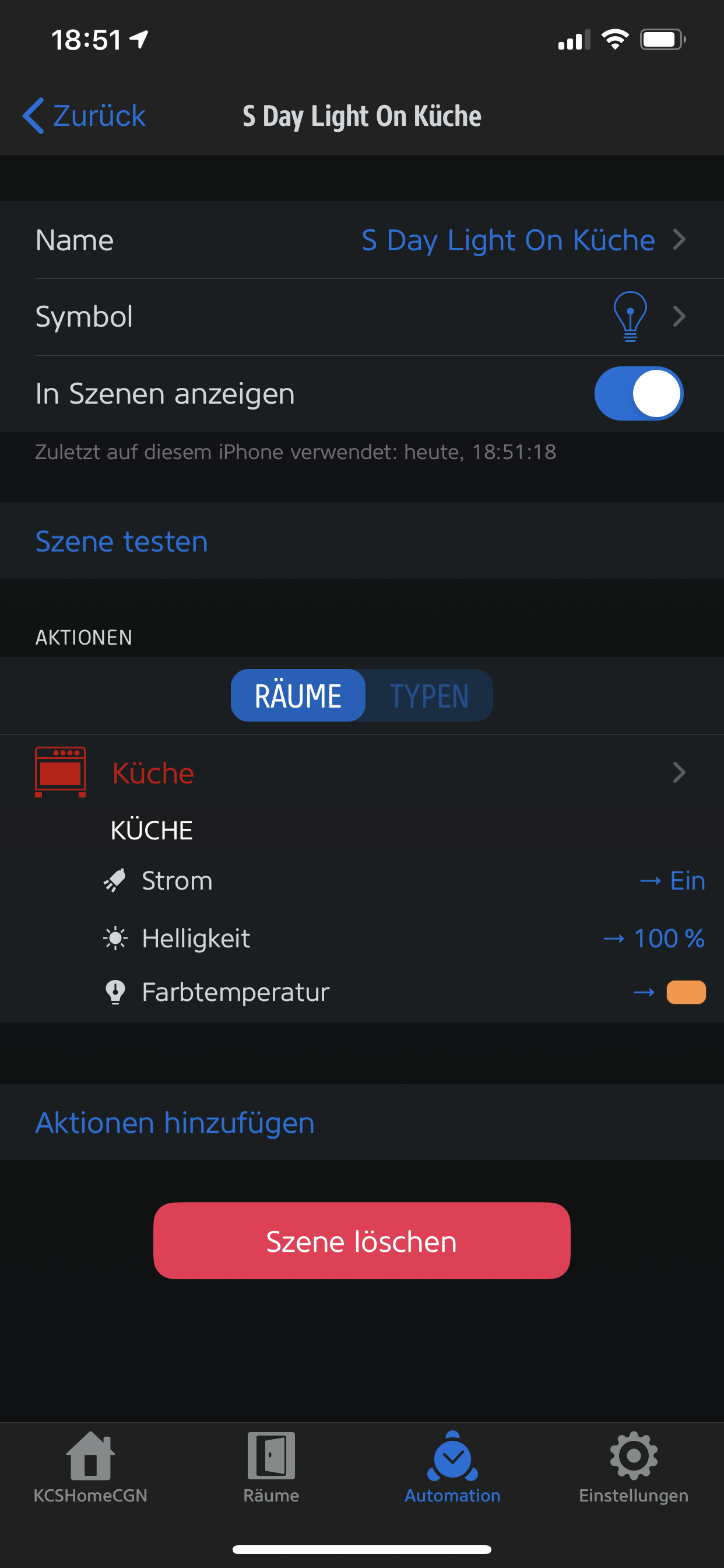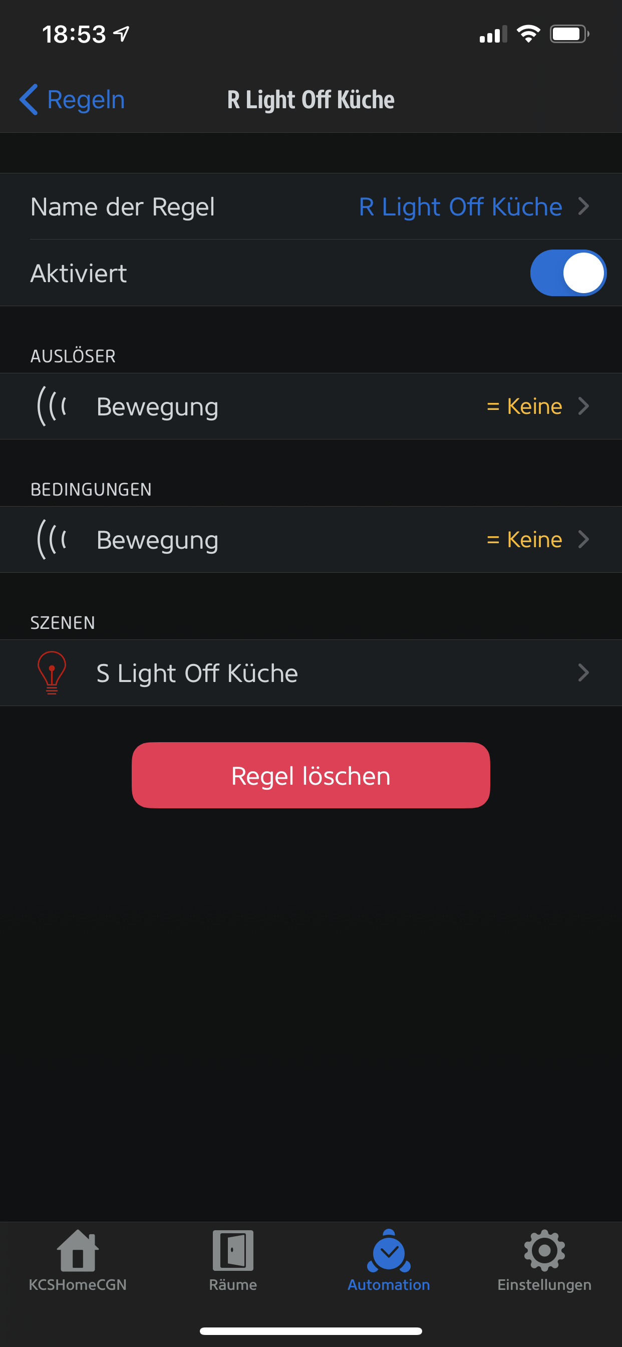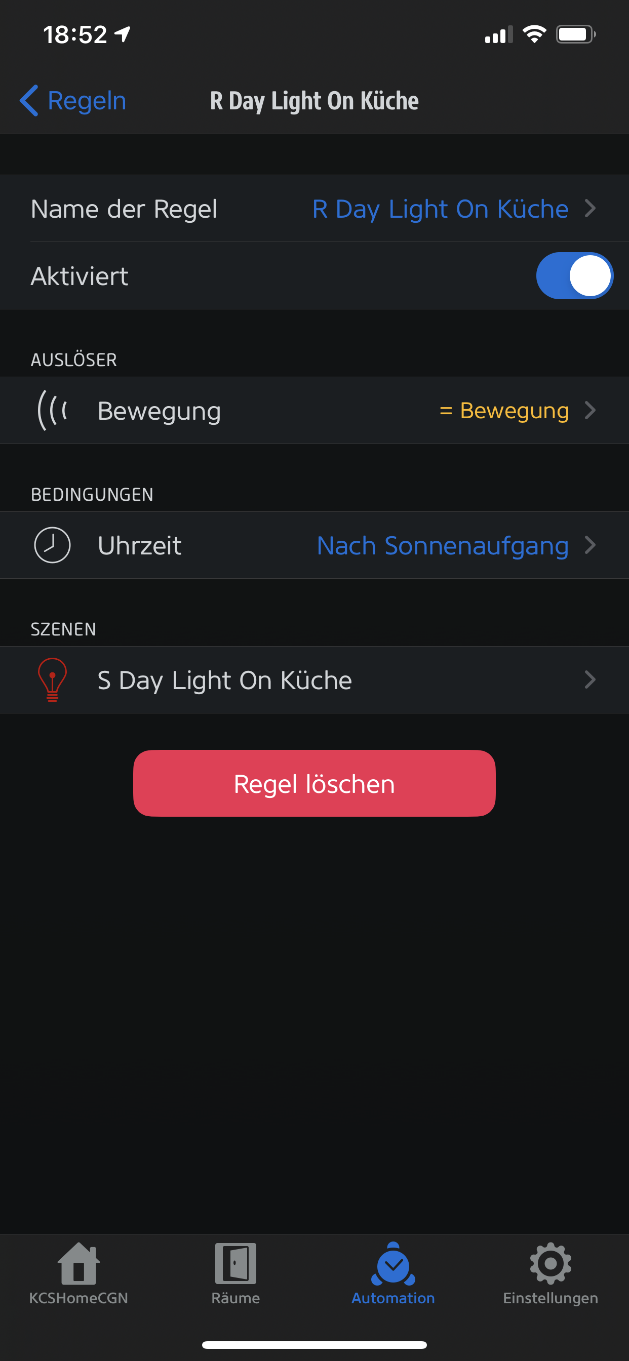 Alles klar, dann hoffe ich mal Du erkennst auch was. Ich hab jetzt der Einfachheit halber mal nur die Konfig der Diele (Küche) angehängt. Jeweils Szene und Regel für Taglicht und Nachtlicht: