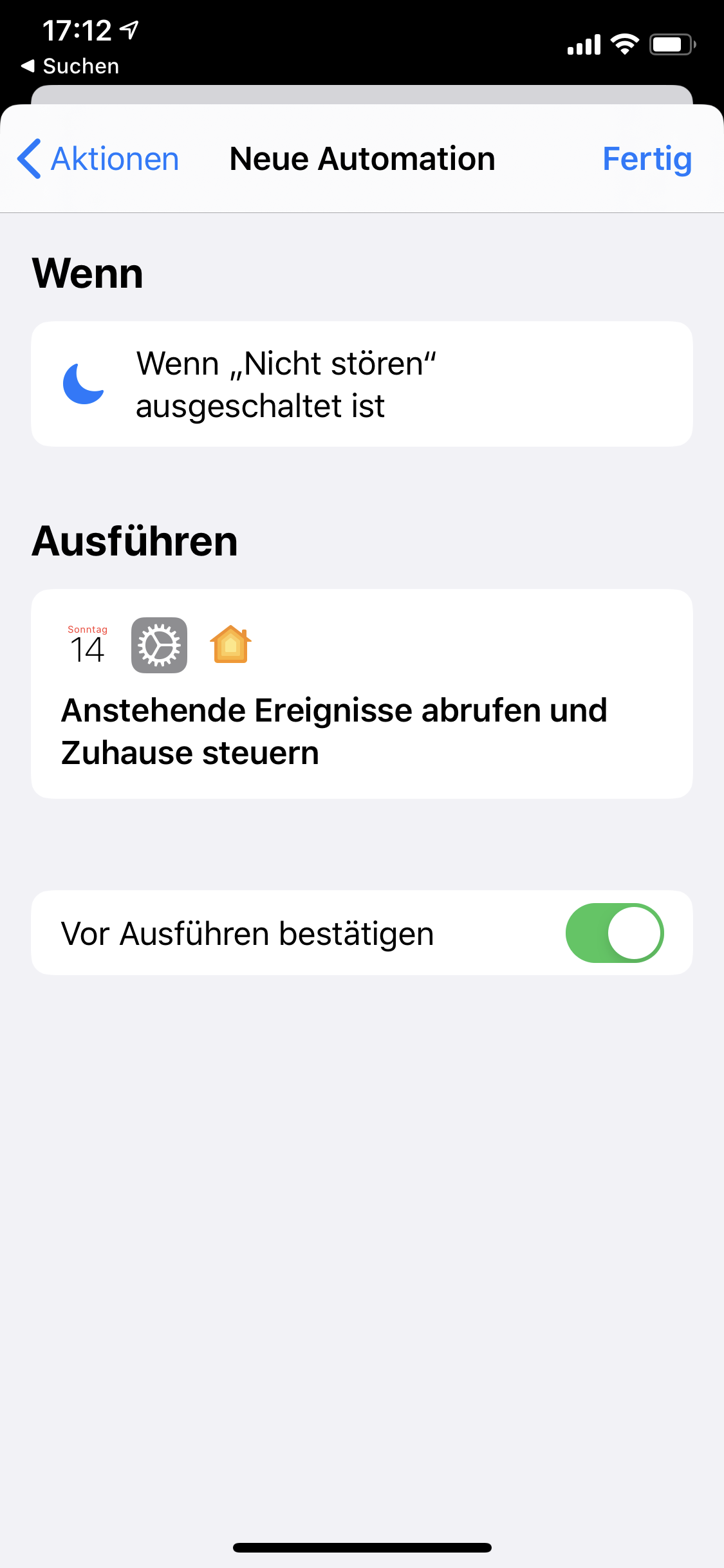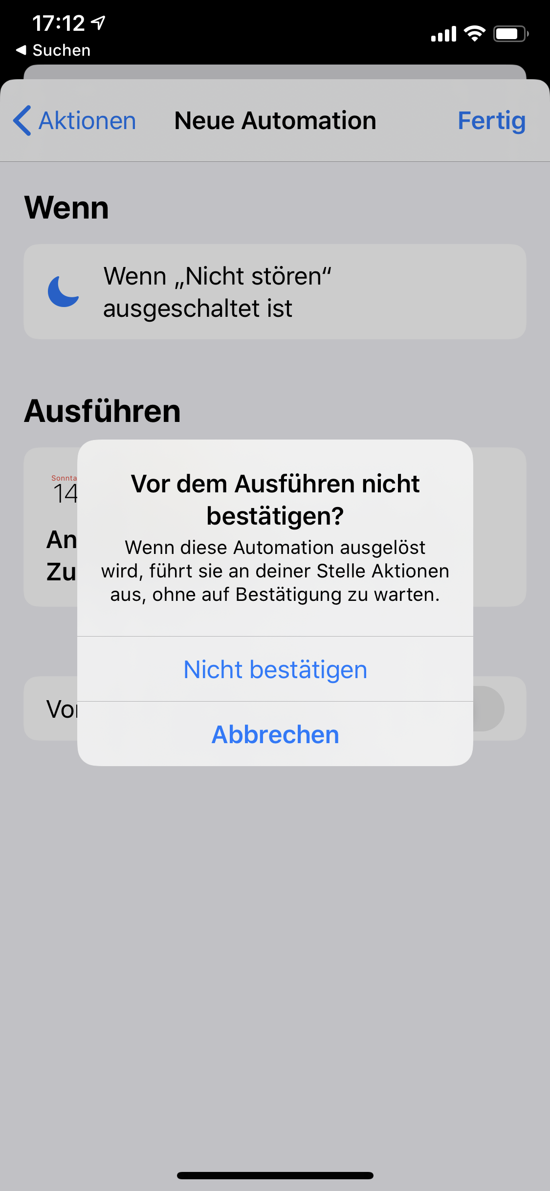 Und zwar ist das die „Nicht stören Funktion“ des iPhones. Wenn du also den Trigger auf „nicht stören ausschalten“ oder einen der anderen beiden setzt, dann kannst du im Folgeschritt auswählen ob die die Automation bestätigen willst.