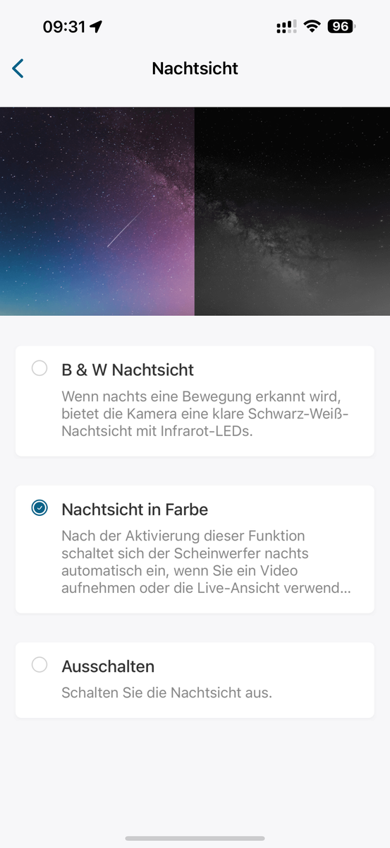 Ich dachte mit einem zusätzlichen Eufy Bewegungsmelder könnte ich das Problem einfach lösen. Also Automation eingerichtet: wenn der Bewegungsmelder eine Bewegung erkennt soll die Kamera die Aufnahme (nachts mit Beleuchtung) starten. Die Aufnahmen werden wunschgemäß bei erkannten Bewegungen tatsächlich gestartet. Leider bei einer ausgelösten Aktivität bleibt (auch nachts) das Licht aus. In den Einstellungen der Kamera sind "Bewegungsaktiviertes Licht" und "Nachtsicht in Farbe" aktiv.