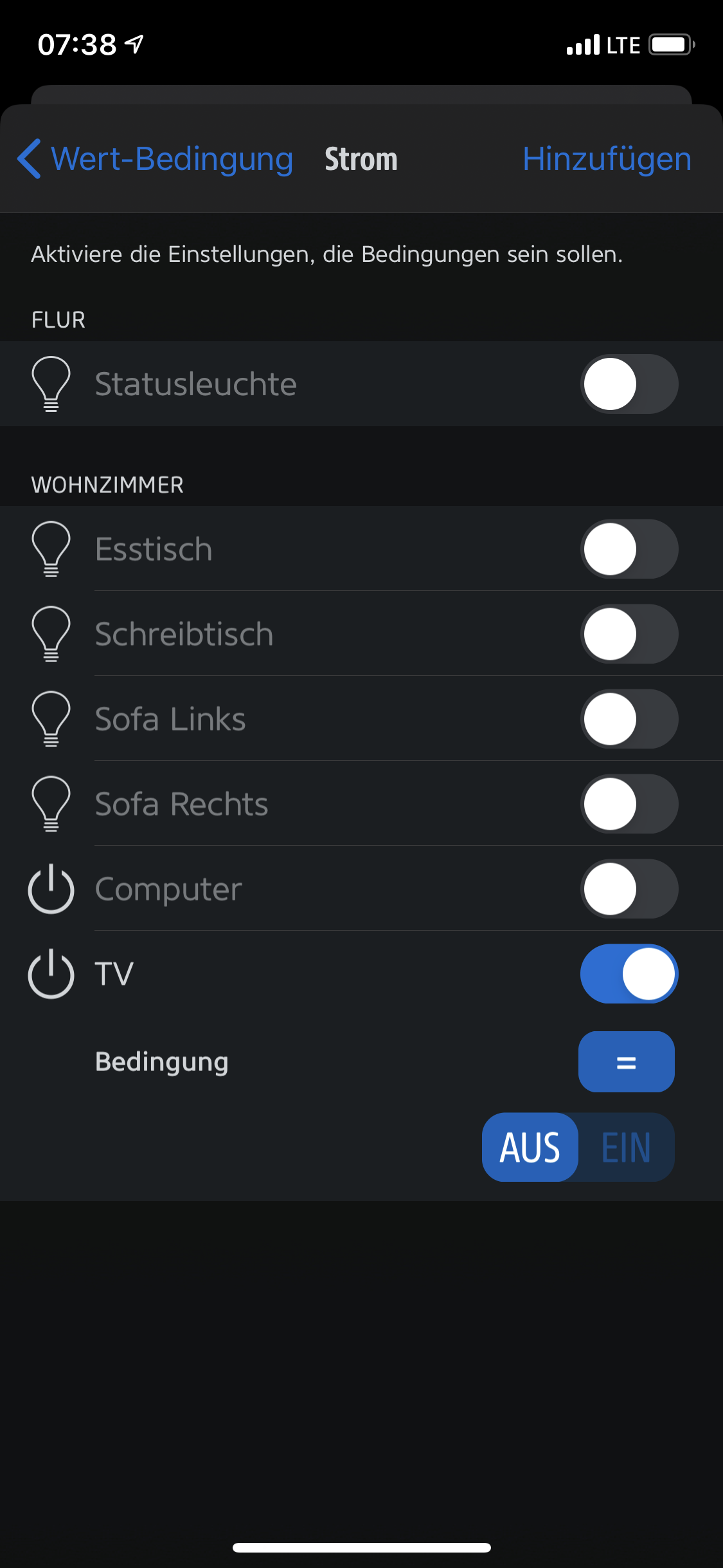 Hier fügst du den leeren Eve Schalter hinzu der die Anlage scharf schaltet. Sprich: Wertbedingung-Strom-Schalter auswählen-EIN.