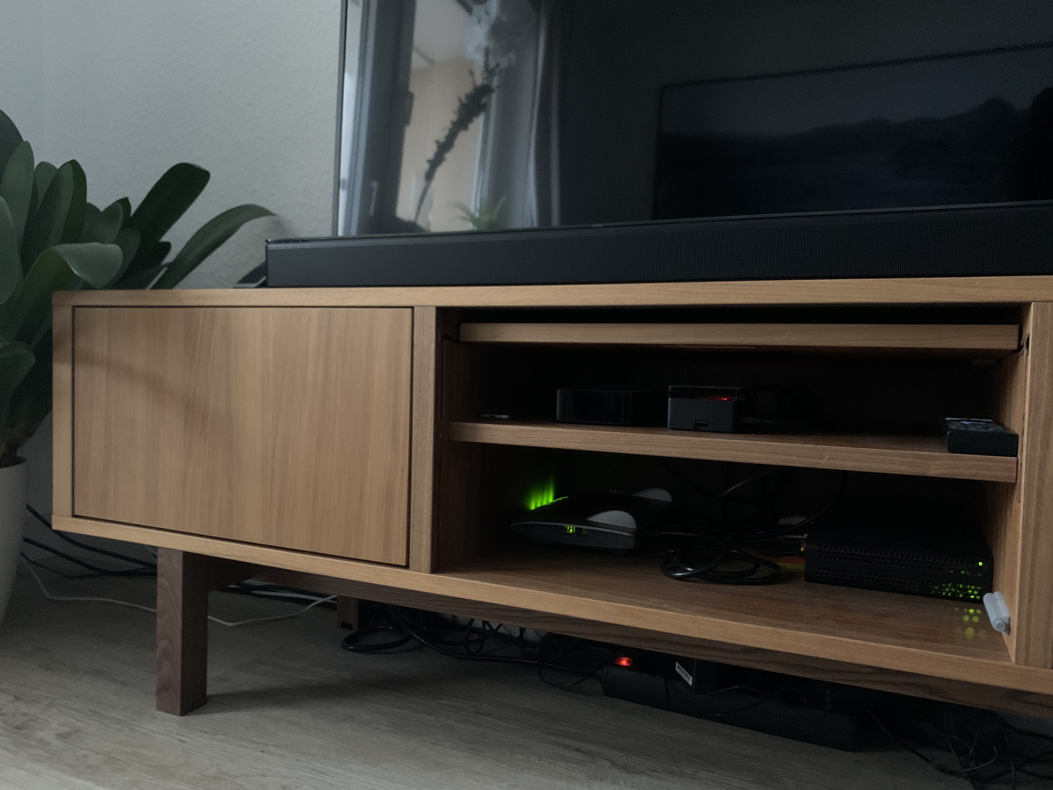Leider muss ich in einer Mietwohnung mit den Gegebenheiten leben, daher landet vorerst alles noch im TV-Schrank. Oben ist ein Apple TV als Steuerzentrale und daneben ein Raspbi 3B+ in einem schwarzen anidees Aluminumgehäuse (FLIRC passt nicht wegen Raspbee-Aufsteckmodul). Darunter Kabelmodem und Fritzbox 4040. Demnächst kommt noch ein Synology DS218 und eine Tado Bridge dazu.