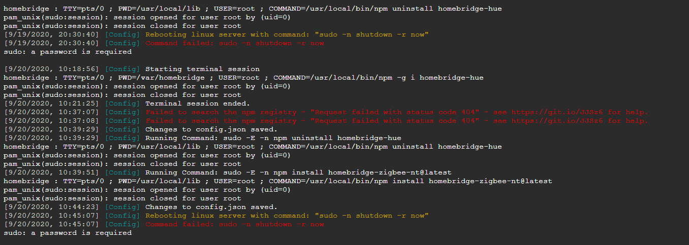 $ sudo systemctl restart homebridge; sudo journalctl -fau homebridge