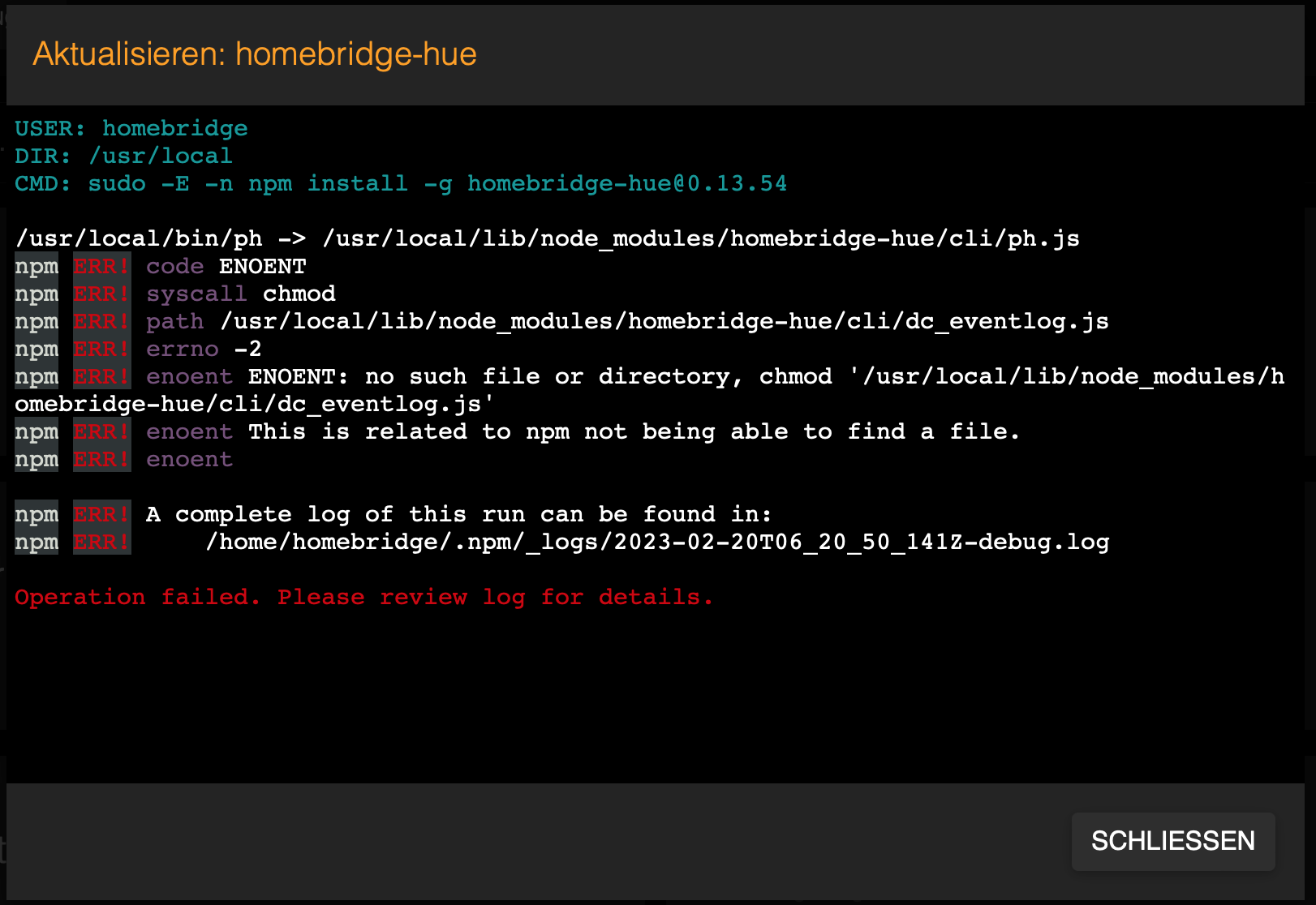 Alles anzeigenpi@phoscon:~ $ sudo npm install -g --unsafe-perm homebrige-hue npm ERR! code E404 npm ERR! 404 Not Found - GET https://registry.npmjs.org/homebrige-hue - Not found npm ERR! 404 npm ERR! 404 'homebrige-hue@latest' is not in the npm registry. npm ERR! 404 You should bug the author to publish it (or use the name yourself!) npm ERR! 404 npm ERR! 404 Note that you can also install from a npm ERR! 404 tarball, folder, http url, or git url. npm ERR! A complete log of this run can be found in: npm ERR! /root/.npm/_logs/2023-03-06T08_52_55_585Z-debug.logHier das Logfile: