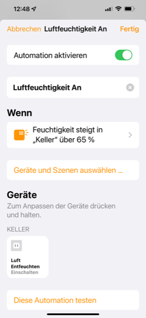 Zweite: Wenn Feuchtigkeit (Qingping Air Monitor) steigt über 75% dann Steckdose (EVE Energy) einschalten und hier hängt ein Luftentfeuchter.