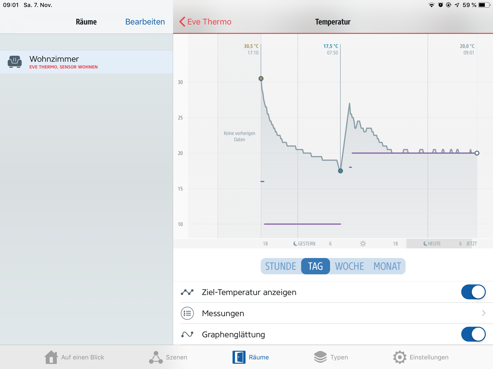 Das kann man in der Grafik sehr schön sehen - nachdem ich die beiden 2 Cent Stücke dazwischen hatte und meine völlig überheizte Bude endlich auf den eingestellten Zielwert abgekühlt war, erkennt man die kurzen „Spitzen“ wo die Temperatur am Thermostat jeweils kurz ansteigt. Hier öffnet der Thermostat also kurz, um die Raumtemperatur nicht weiter absacken zu lassen. Kurzum: Die Regelung funktioniert endlich!