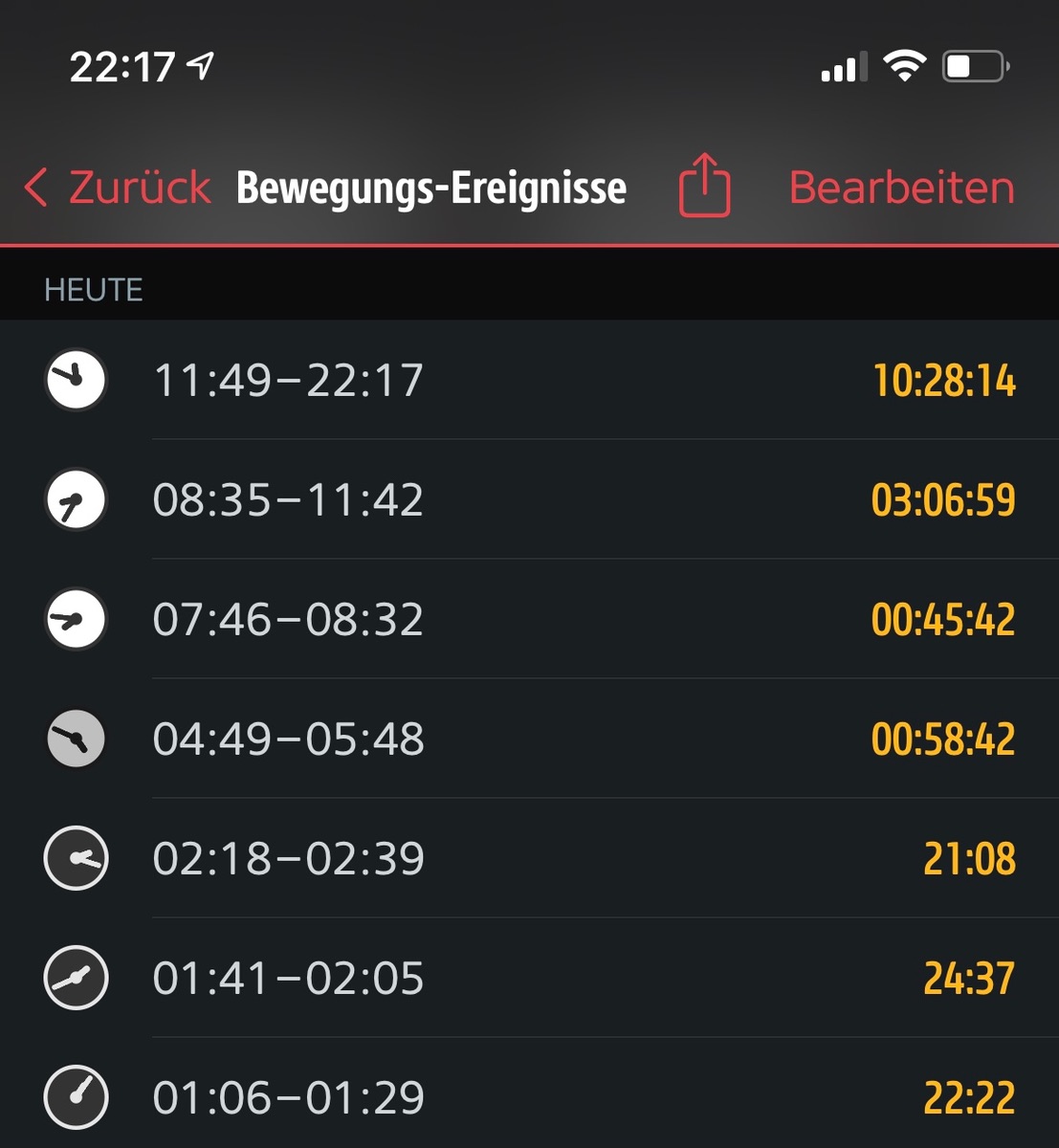 Im Bild seht ihr, dass die Bewegung um 11:49 Uhr das erste Mal erkannt wurde und erst abgeschaltet wurde um 22:17 Uhr, nachdem ich ihn weggedreht habe.