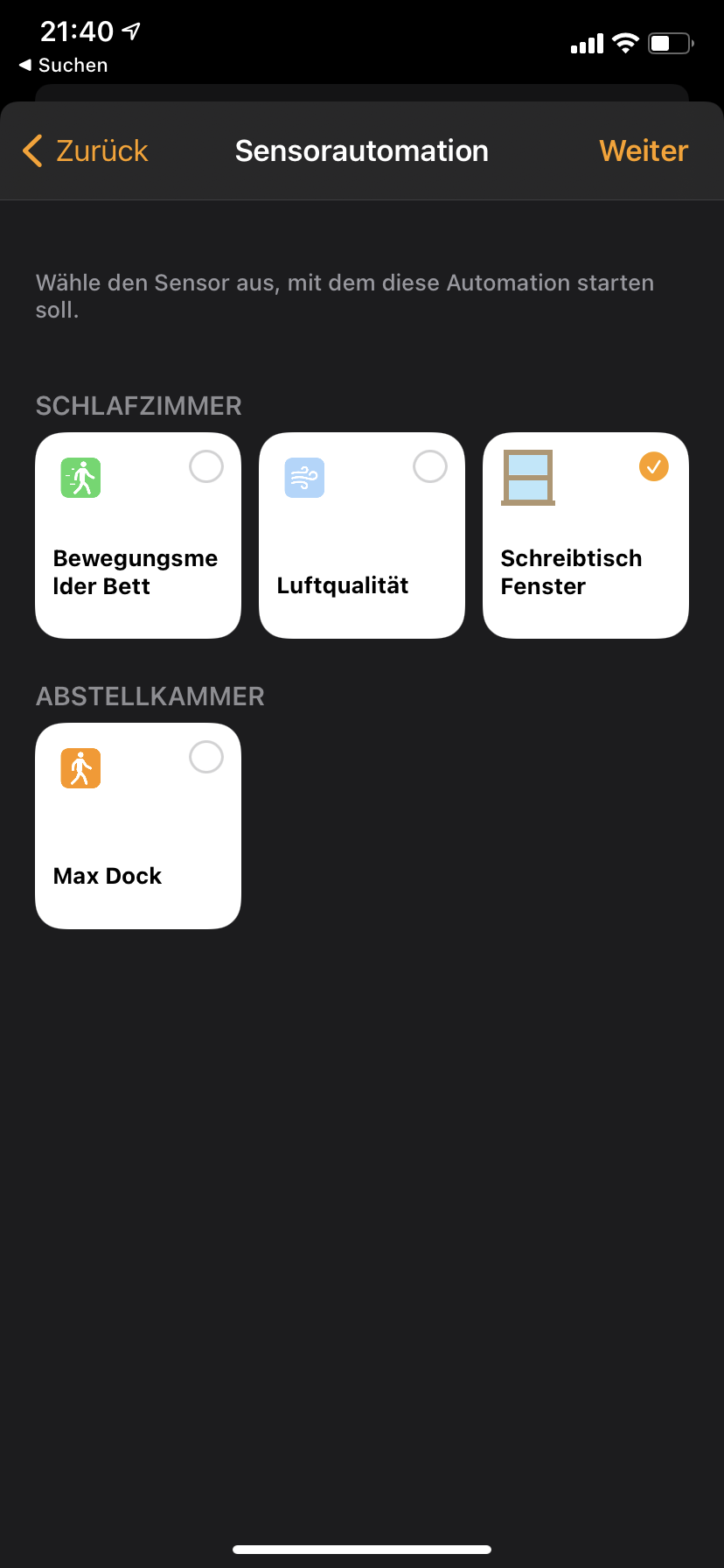 Dann wählst du den Fensterkontakt aus über den der Thermostat gesteuert werden soll und Tippst auf weiter.