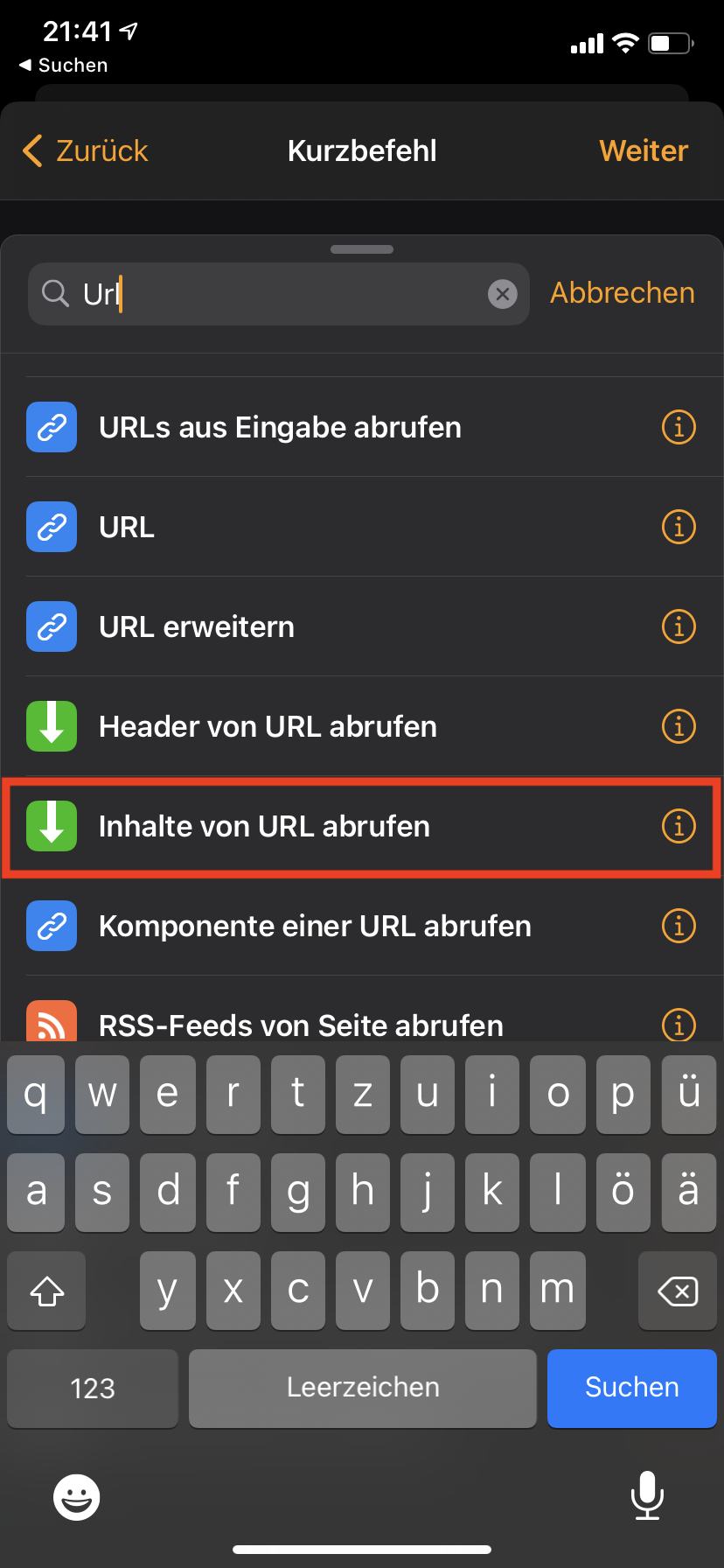 Hier Entfernst du den HomeKit Befehl mit dem Kleinen Grauen X und wählst "Aktion hinzufügen". Hier suchst du nun "url" und wählst "Inhalte von URL abrufen"