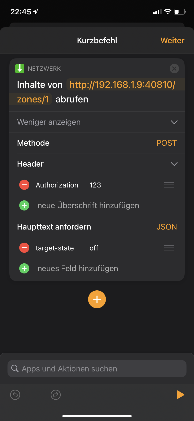 Bei "Haupttext anfordern" lässt du JSON ausgewählt und tippst auf "neues Feld hinzufügen". Nun möchte HomeKit wissen welche Art wert du hinzufügen möchtest. Hier wählst du "Text" aus und gibst bei "Schlüssel" "target-state" und bei "Text" "off".