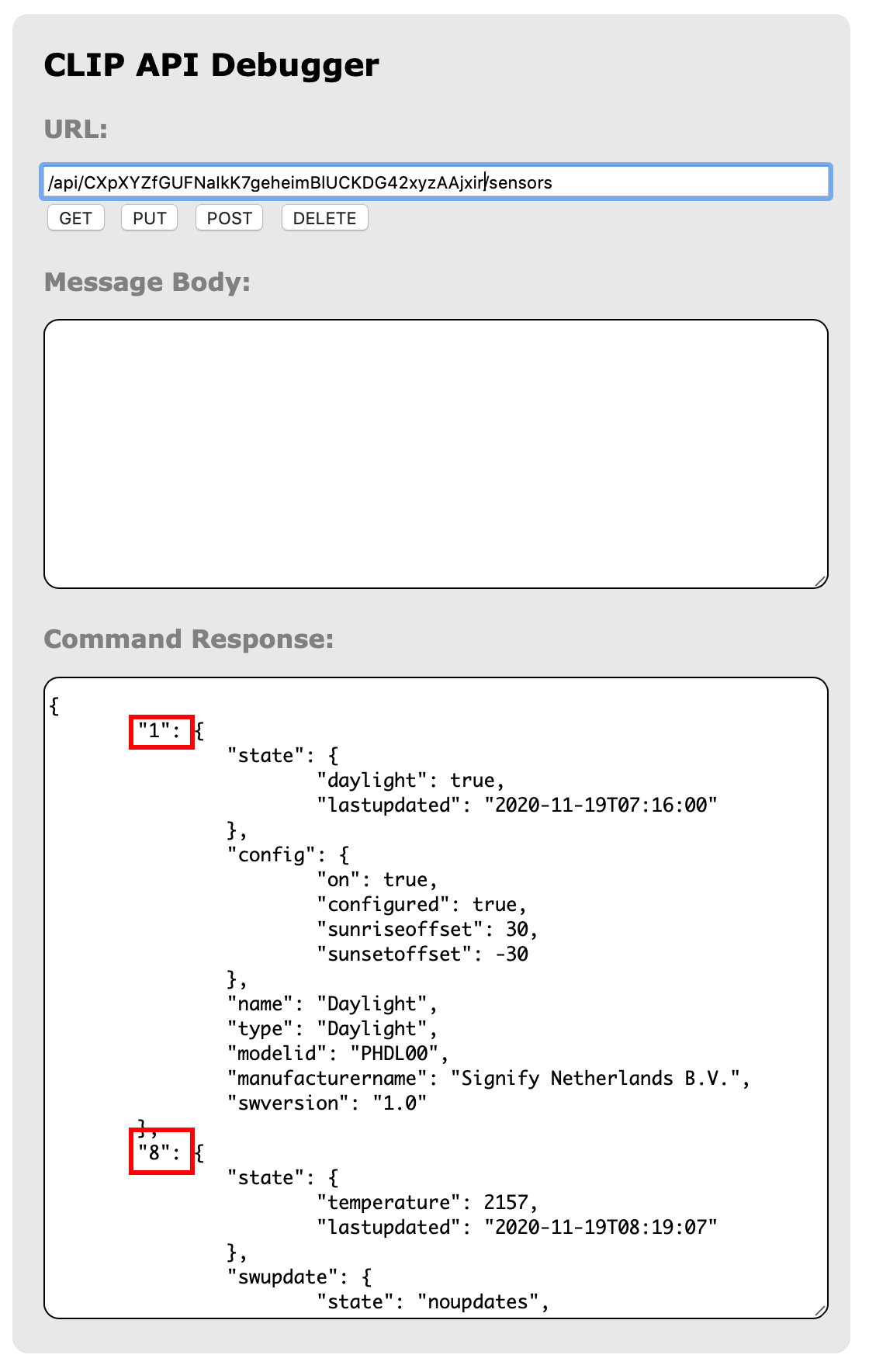 /api/CXpXYZfGUFNaIkK7geheimBlUCKDG42xyzAAjxir/sensors und klickst auf GET. Das Eingabefeld Message Body bleibt leer. Du erhältst eine Ausgabe im Ausgabefeld Command Response, die nicht sonderlich übersichtlich ist: