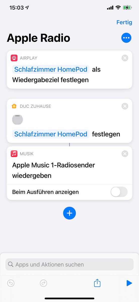 Allerdings wird zu dem Zeitpunkt zwar die Automation/Kurzbefehl gestartet, aber der Kurzbefehl schaltet die AirPlay Wiedergabe nicht auf den HomePod mini wie angegeben und was im Test funktioniert, sondern lediglich auf dem iPhone.
