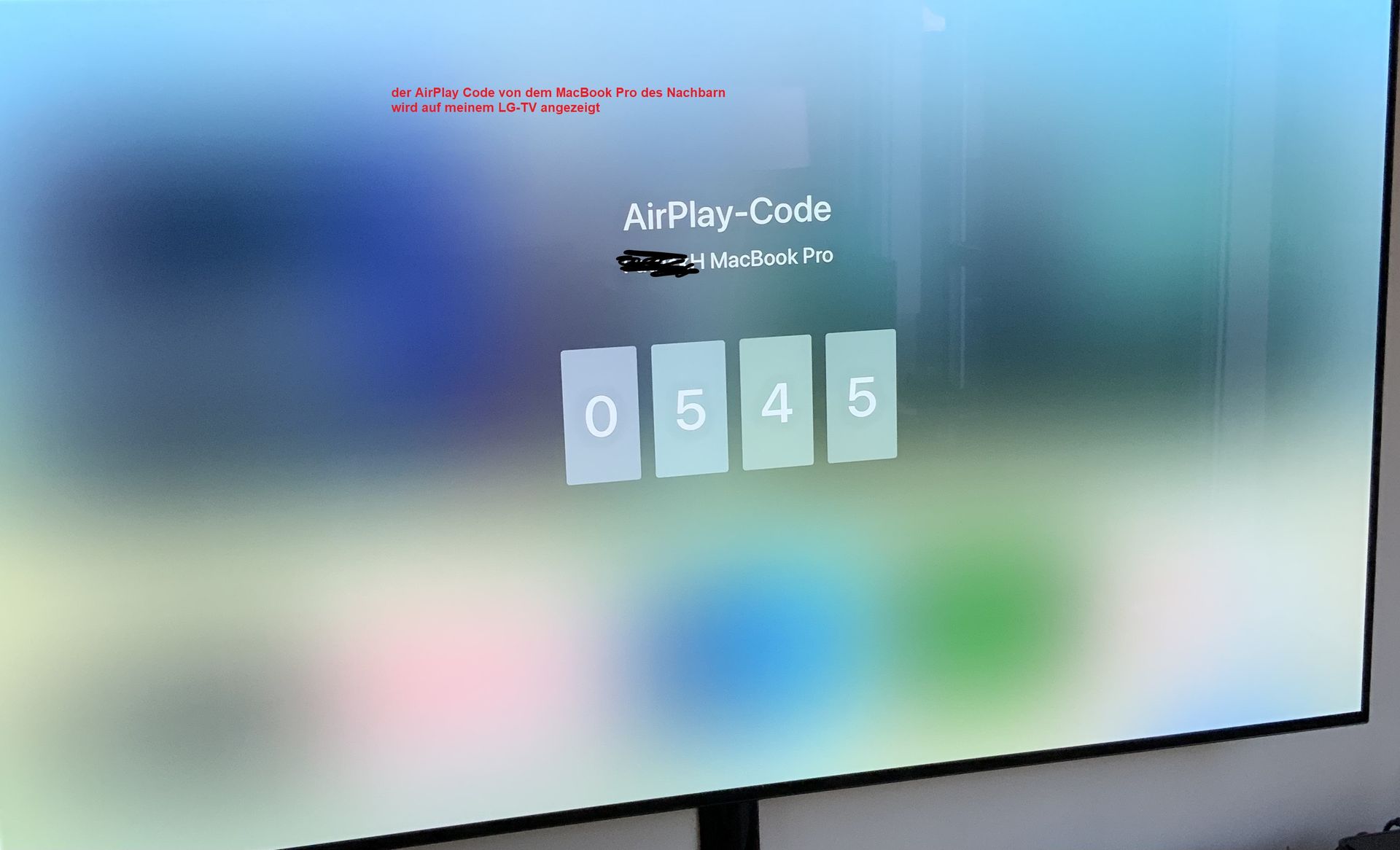 - dabei hat sich mein LG TV (Homekit eingebunden) eingeschaltet und zeigte (s)einen 4-stelligen Airplay Code an (Bild1)