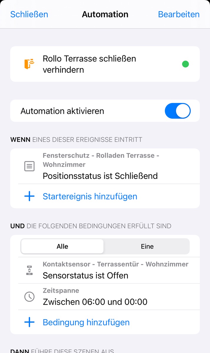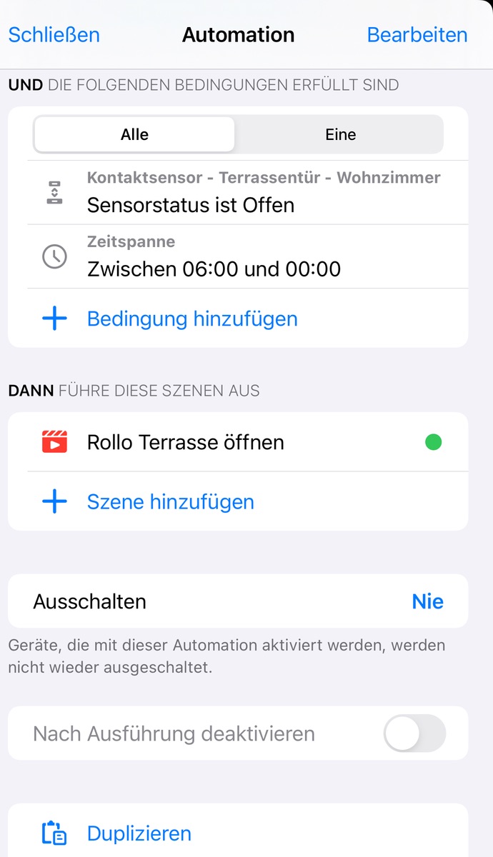 ich finde leider keinen Hinweis, wo mein Problem liegt. Die Automation wurde mit Controller for HomeKit erstellt. Das Gleiche mit EVE bringt ebenfalls keine Besserung.